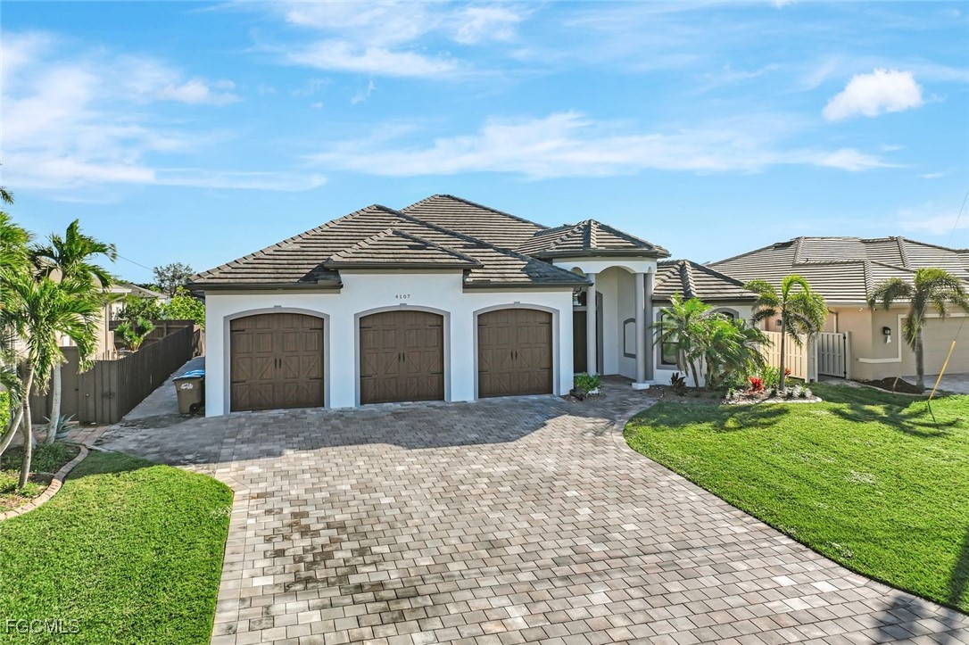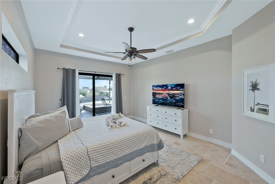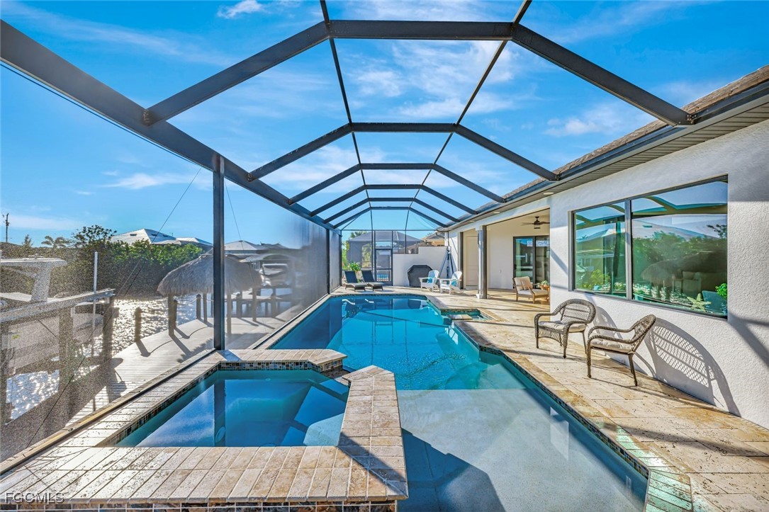 2 Owners Suites, Gulf Access, w/Pool, Composite Dock & 16k Boat Lift! Elegant & Modern, Durable & Efficient - Built to last in 2018 using ICF (Insulated Concrete Form) Construction w/STEEL REINFORCED POURED CONCRETE WALLS that reduces noise, are energy efficient, mold & mildew resistant, & most importantly ensures to protect against fires & hurricanes. 4-BR, PLUS den, ICF-built home offers over 3,100 sqft of living space & blends timeless travertine stone, neutral colors & nautical touches throughout. From the moment you pull up you can see this is not like the others. It starts w/the HUGE paver driveway that can accommodate 6+ cars, 3 oversized custom hurricane rated garage doors, stylish flat tile roof & paver walkway that leads to the elegant double door entry. Step inside to a grand foyer w/double-trayed ceiling adorned w/crown molding, decorative niches & tile inlay all creating an immediate sense of luxury. Travertine flooring flows from the front door through the entire home, all the way to the dock area & beyond. Great room boasts 12-foot coffered ceilings w/backlighting, complemented by 90-degree pocket sliding doors that seamlessly integrate indoor & outdoor living spaces. Formal dining area features tray ceilings w/recessed lighting & crown molding. Gourmet kitchen showcases Samsung Smart Connect appliance package, wall oven, stovetop, custom cabinets w/spice rack, dove-tail soft-close drawers, vent hood, tile backsplash and prep island w/ample counter space. Laundry room offers direct access to the owner's suite, featuring granite countertops for folding, upper & lower cabinets, & LG stacked washer & dryer. The spacious primary bedroom offers private lanai access, water views, & tray ceilings w/recessed lighting & crown molding. The ensuite bathroom is a spa-like retreat w/floor-to-ceiling travertine, soaking tub, walk-through shower w/multiple shower heads, & transom windows allowing for natural light. Home offers a second owner's suite w/private lanai access, an en-suite bathroom/pool bath & walk-in closet for added convenience. 3-car garage is a standout feature, offering 12-foot ceilings (car lift friendly) & tiled floors, providing functionality & aesthetic for the perfect handyman haven. Step outside to your personal paradise. The lanai boasts unobstructed water views through picture window screens, heated custom pool w/sun shelf, lounging bench & cascading spa. Boaters will delight in the newer built low maintenance composite dock featuring tiki hut w/power & lighting &16,000 lb boat lift. Additional features include roll-down shutters, French drains, low maintenance zero scaping, & an outdoor shower on the lanai. This home is a true gem, offering an unmatched combination of elegance, functionality, durability & waterfront living. Assessments paid & furnishings are negotiable making this the perfect combination for YOUR luxury getaway! Don't miss the opportunity to make this stunning property your own!
