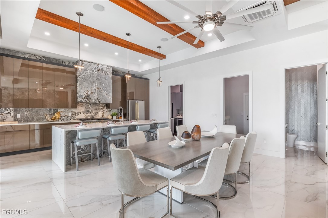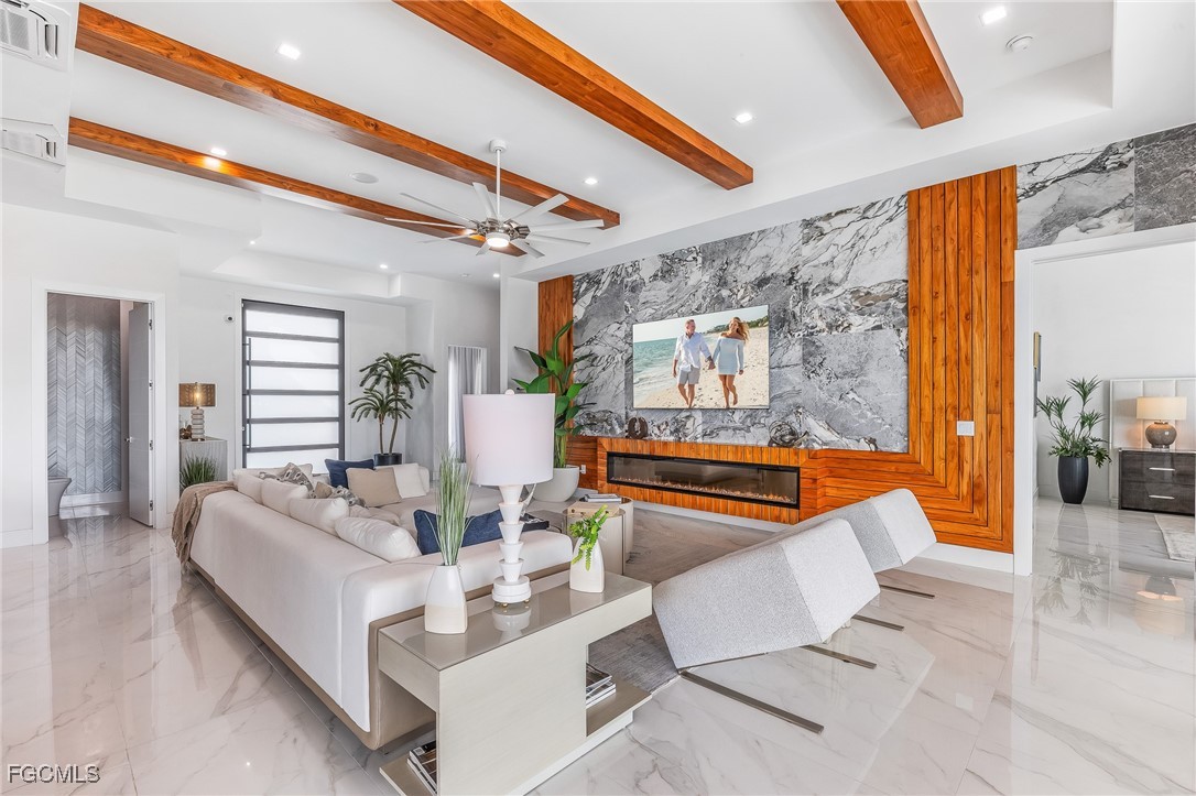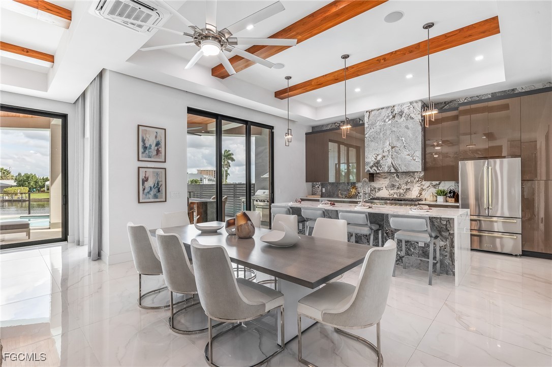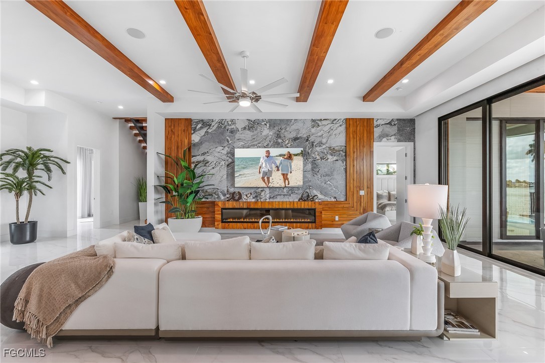 In the outdoor living space, the home opens to a breathtaking outdoor oasis: an infinity-edge pool that visually merges with the canal, a relaxing spa, sun shelf, spacious patio, outdoor kitchen, and a cozy firepit for nights under the stars. It’s the ideal place for effortless entertaining or quiet evenings at home.