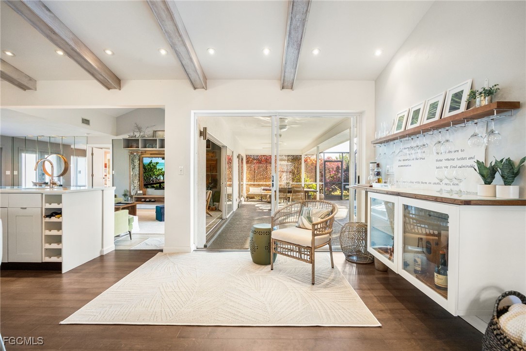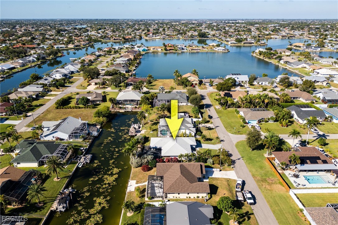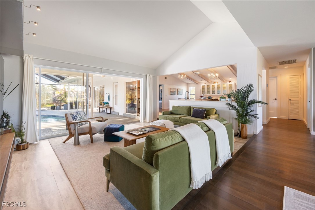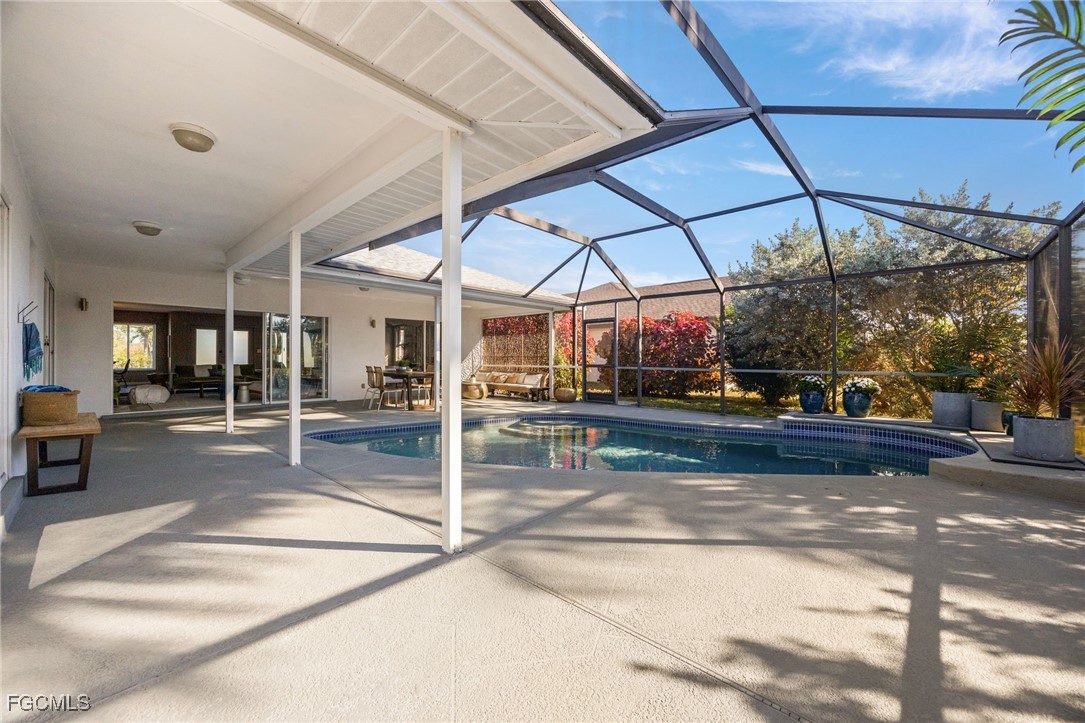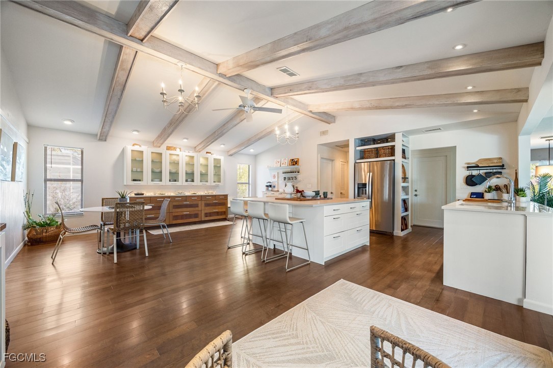 Thoughtfully designed with clean lines and a clutter-free aesthetic, fully furnished, modern living environment with a spacious feel throughout and in the desirable Shamrock Lakes Neighborhood. Step inside this fully renovated home and immediately feel the openness of its expansive great room. Vaulted ceilings with exposed beams, warm engineered hardwood flooring, and abundant natural light create an inviting, airy atmosphere. The modern kitchen features a large island with seating, sleek cabinetry, stainless steel appliances, and extensive storage, all overlooking the spacious dining and living areas—ideal for effortless everyday living. Nearly every major component of the property has been upgraded. 2023 updates include a New Roof / Pool Heater / Exterior paint / Full pool cage screen replacement, and closet doors. Earlier renovations include a lifetime-guaranteed pool resurfacing, tiki hut, both guest and master bath remodeled, Double drawer dishwasher, and all new one-panel interior doors (2020 and prior). Two A/C systems have also been updated. Recent 2025 improvements include a new hot water heater and new living room furniture. Additional upgrades include replaced front windows, garage epoxy and cabinets, and a remodeled front entry. There is an additional patio area off the master suite where you can enjoy the natural surroundings. Tesla Charger in garage. Entertain under the Tiki hut with concrete dock and mature landscaping with privacy. Enjoy boating, fishing, and kayaking right in your backyard where the canal leads to the Shamrock Lakes. Minutes to the Pine Island Corridor where shopping, restaurants and neighborhood necessities are found. Enjoy the activities in Downtown Fort Myers or Downtown Cape Coral in about 20 minutes. Flood Zone is X.