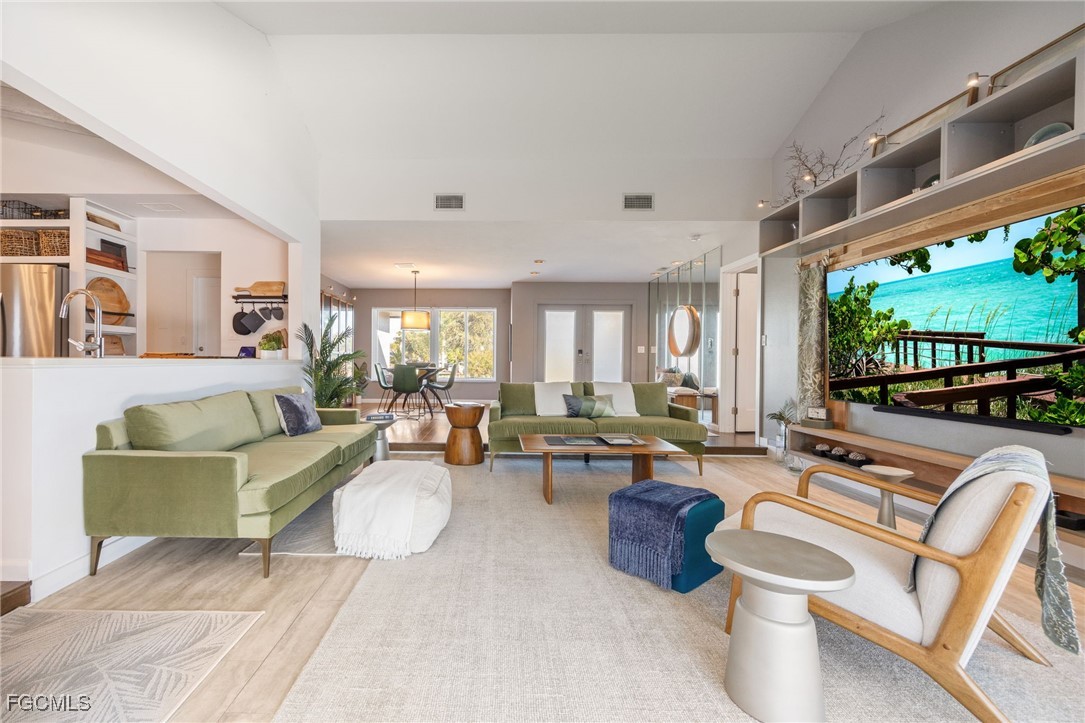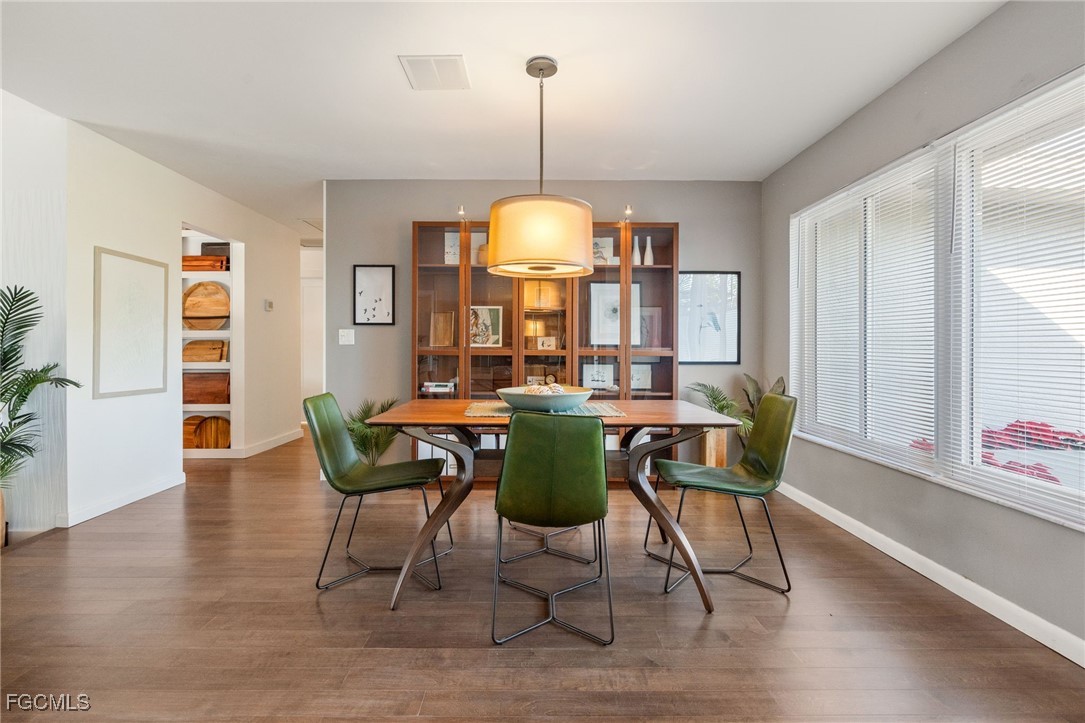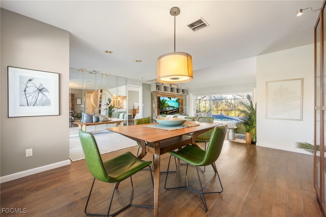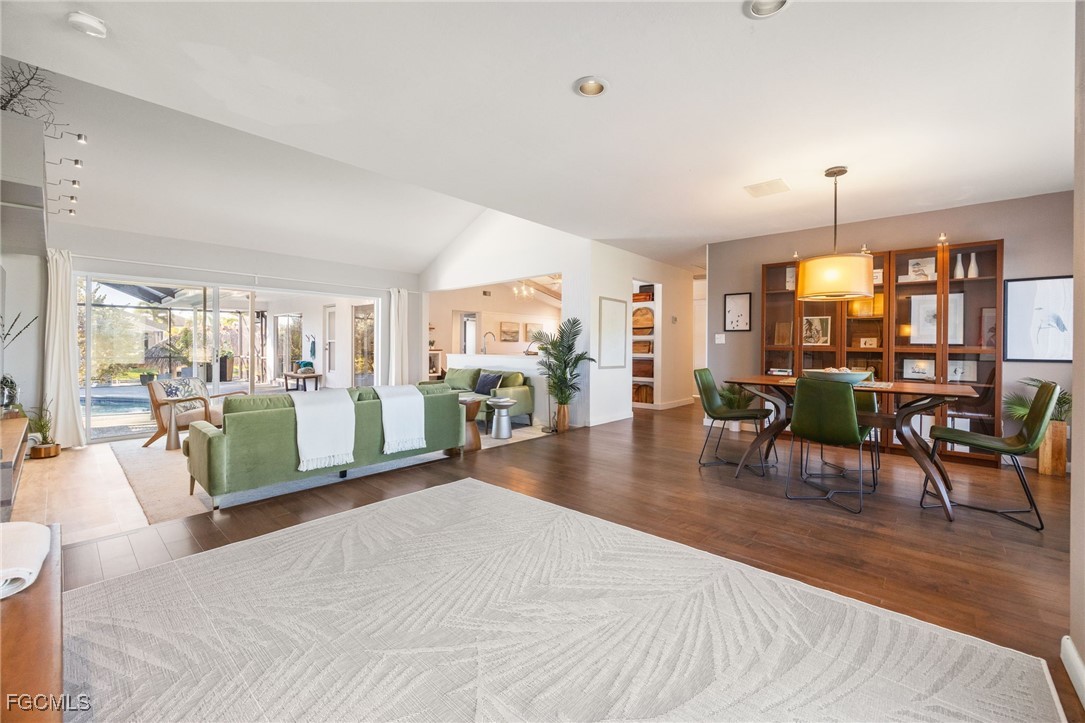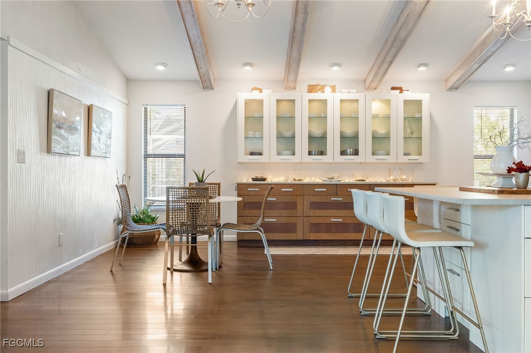 Thoughtfully designed with clean lines and a clutter-free aesthetic, fully furnished, modern living environment with a spacious feel throughout and in the desirable Shamrock Lakes Neighborhood. Step inside this fully renovated home and immediately feel the openness of its expansive great room. Vaulted ceilings with exposed beams, warm engineered hardwood flooring, and abundant natural light create an inviting, airy atmosphere. The modern kitchen features a large island with seating, sleek cabinetry, stainless steel appliances, and extensive storage, all overlooking the spacious dining and living areas—ideal for effortless everyday living. Nearly every major component of the property has been upgraded. 2023 updates include a New Roof / Pool Heater / Exterior paint / Full pool cage screen replacement, and closet doors. Earlier renovations include a lifetime-guaranteed pool resurfacing, tiki hut, both guest and master bath remodeled, Double drawer dishwasher, and all new one-panel interior doors (2020 and prior). Two A/C systems have also been updated. Recent 2025 improvements include a new hot water heater and new living room furniture. Additional upgrades include replaced front windows, garage epoxy and cabinets, and a remodeled front entry. There is an additional patio area off the master suite where you can enjoy the natural surroundings. Tesla Charger in garage. Entertain under the Tiki hut with concrete dock and mature landscaping with privacy. Enjoy boating, fishing, and kayaking right in your backyard where the canal leads to the Shamrock Lakes. Minutes to the Pine Island Corridor where shopping, restaurants and neighborhood necessities are found. Enjoy the activities in Downtown Fort Myers or Downtown Cape Coral in about 20 minutes. Flood Zone is X.