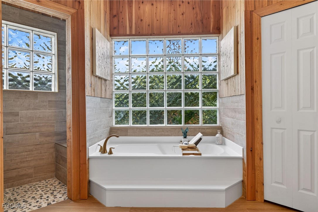 The oversized primary suite is light and bright, featuring a tray ceiling, sliders to the pool and lanai, and a sitting area ideal for enjoying spectacular western sunsets. The spa-like ensuite bath has been beautifully updated with new flooring, tile, vanities, fixtures, and a rainfall shower head. Ample storage includes two walk-in closets and a linen closet.