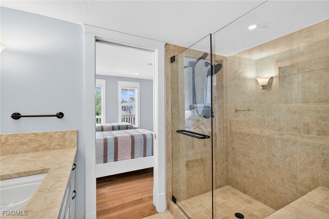 The primary bedroom is privately situated on the second floor and feels like a true sanctuary. Vaulted ceilings and warm wood flooring create an airy, calming atmosphere, while sliding glass doors open to a private balcony with sweeping views of the canal and bay. It is the perfect place to unwind, morning or night.