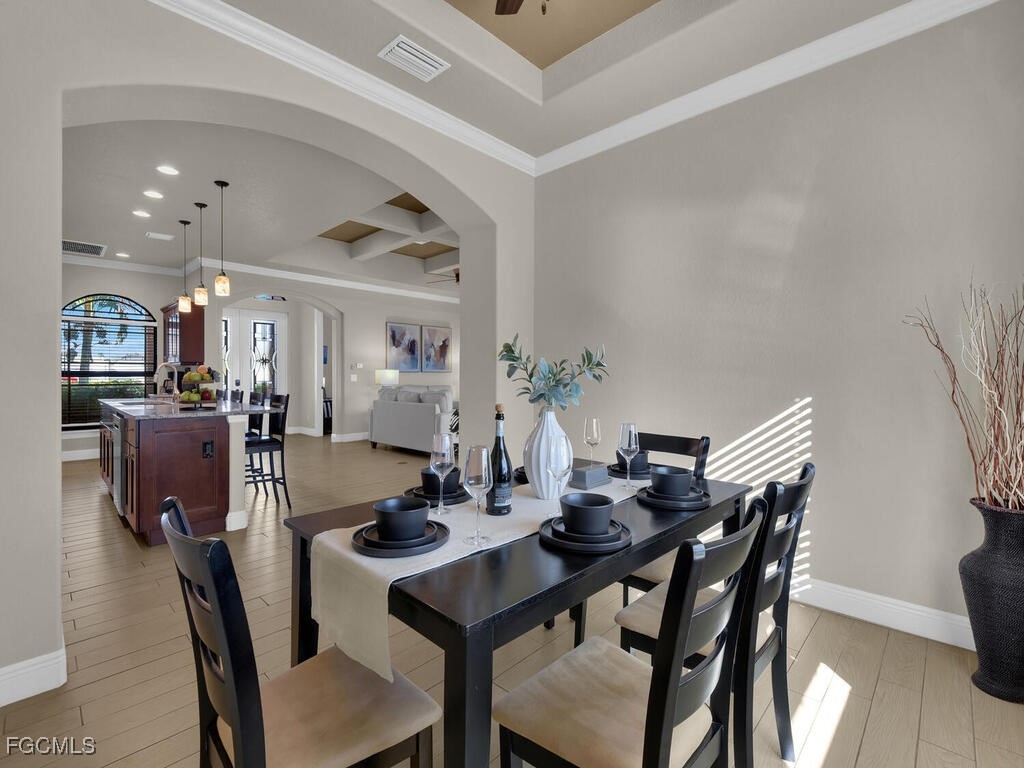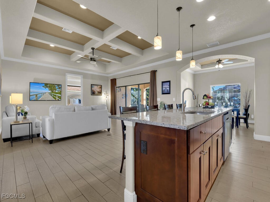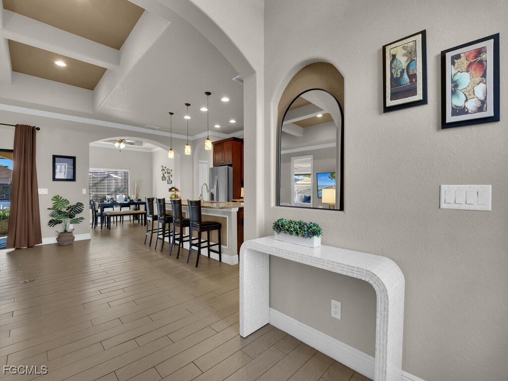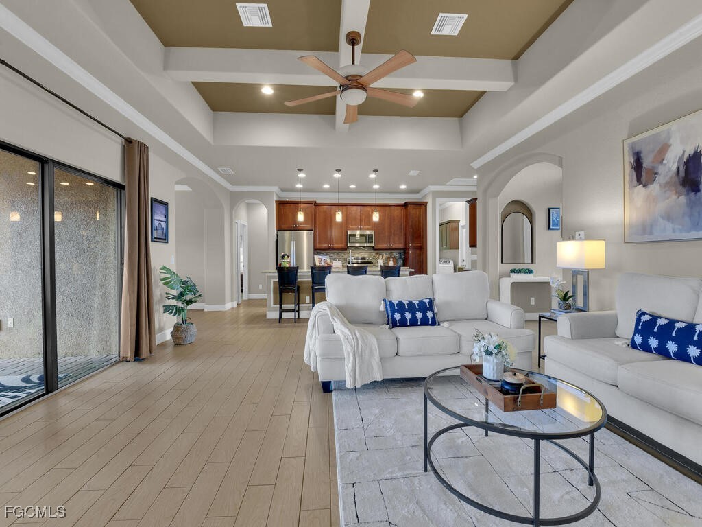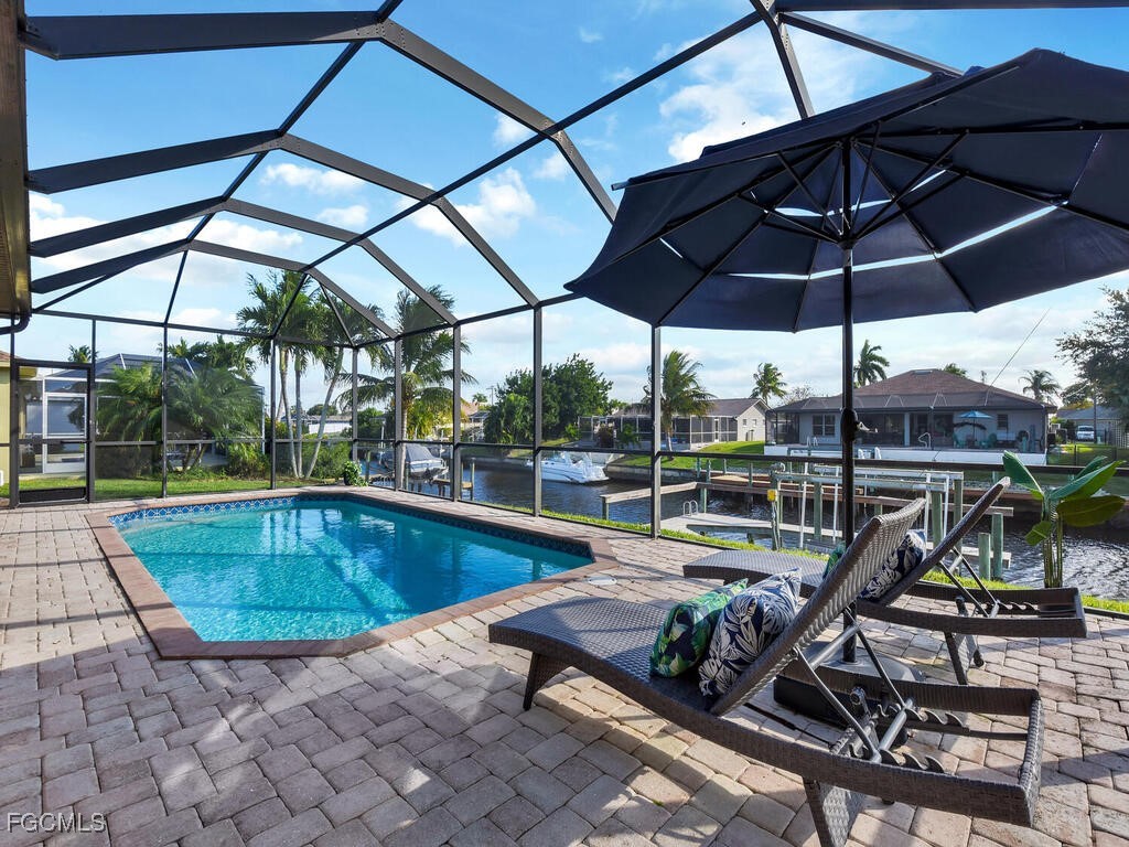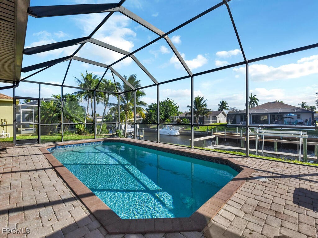 Built in 2015 and thoughtfully designed, this immaculate and tastefully decorated home is being offered turnkey so come inside and be wowed by its grand glass door entry, beautiful ceramic floor tiles leading to the open concept floor plan completed by soaring tray ceilings. This home features 3 spacious bedrooms, 2 full bathrooms plus a den, sparkling enclosed pool, a brand-new boat dock and lift, making it effortless to enjoy resort style living. Centrally located with quick access across both bridges to Fort Myers, RSW airport, beaches, local bars, restaurants, shops, grocery stores, top schools and hospitals make this location truly desireable. This home is NOT in a flood zone so come secure this beautiful home and make it yours - you deserve it!