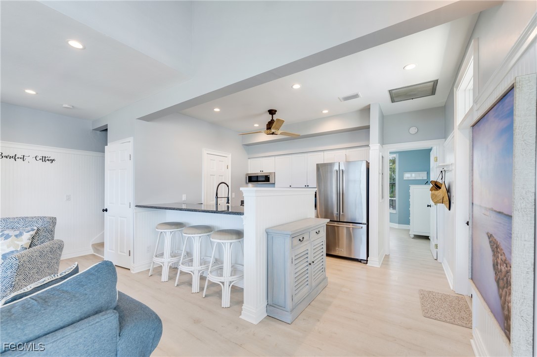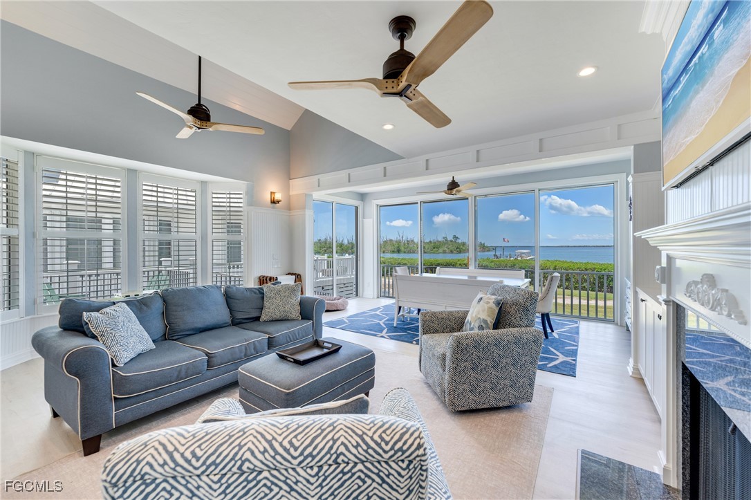 Inside, the front entry opens to an inviting open-concept kitchen and living area, finished in clean coastal style. A wall of sliding glass doors frames uninterrupted water views and is protected by roll-down storm screens. The first floor was comprehensively renovated in 2022, featuring new flooring, interior lighting, ceiling fans, and fresh paint throughout. The kitchen was fully updated with new refrigerator, dishwasher, stove, and microwave, along with a new LG washer and dryer.
