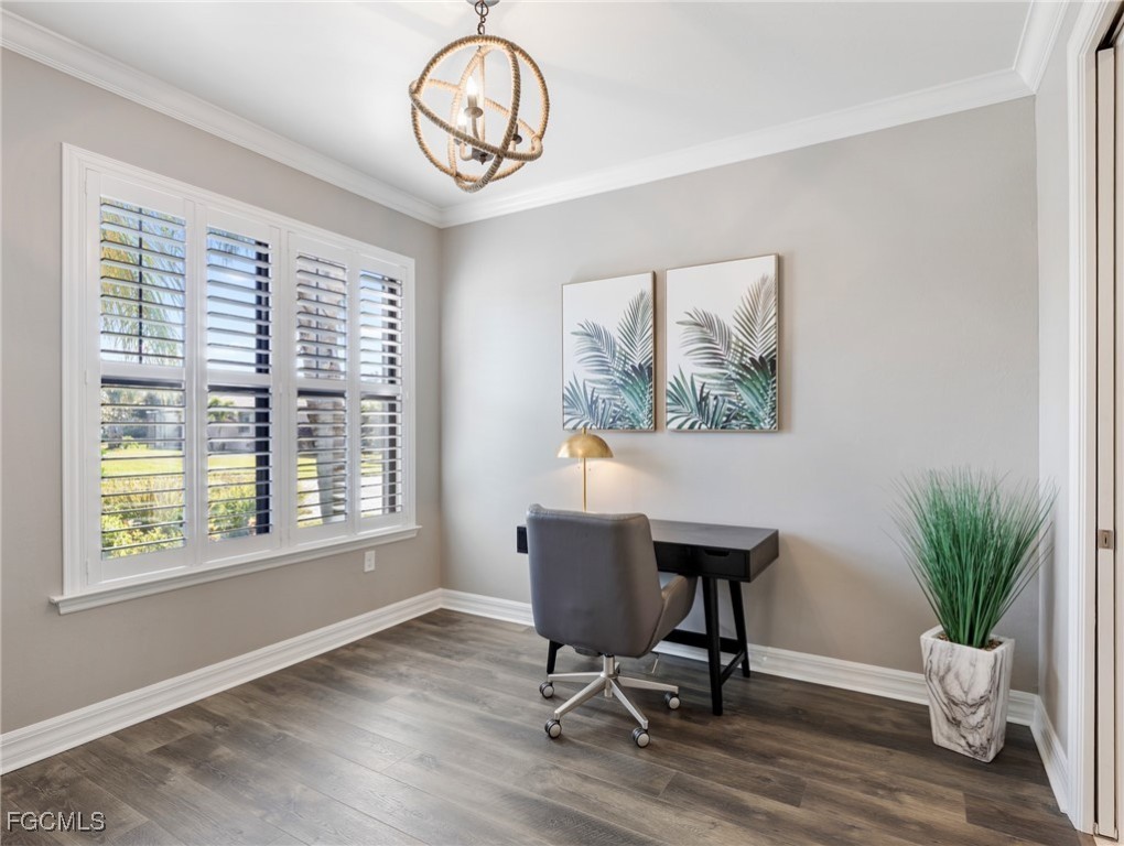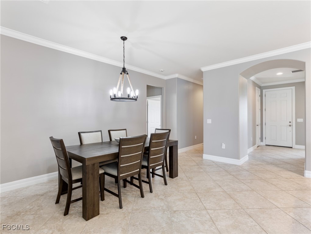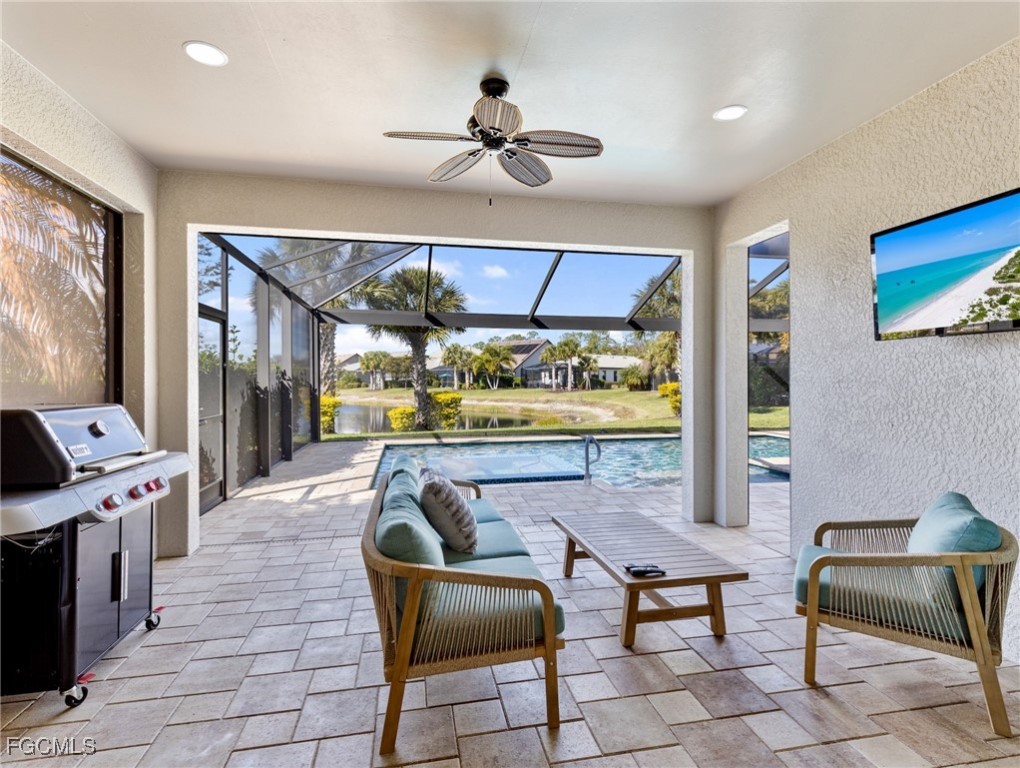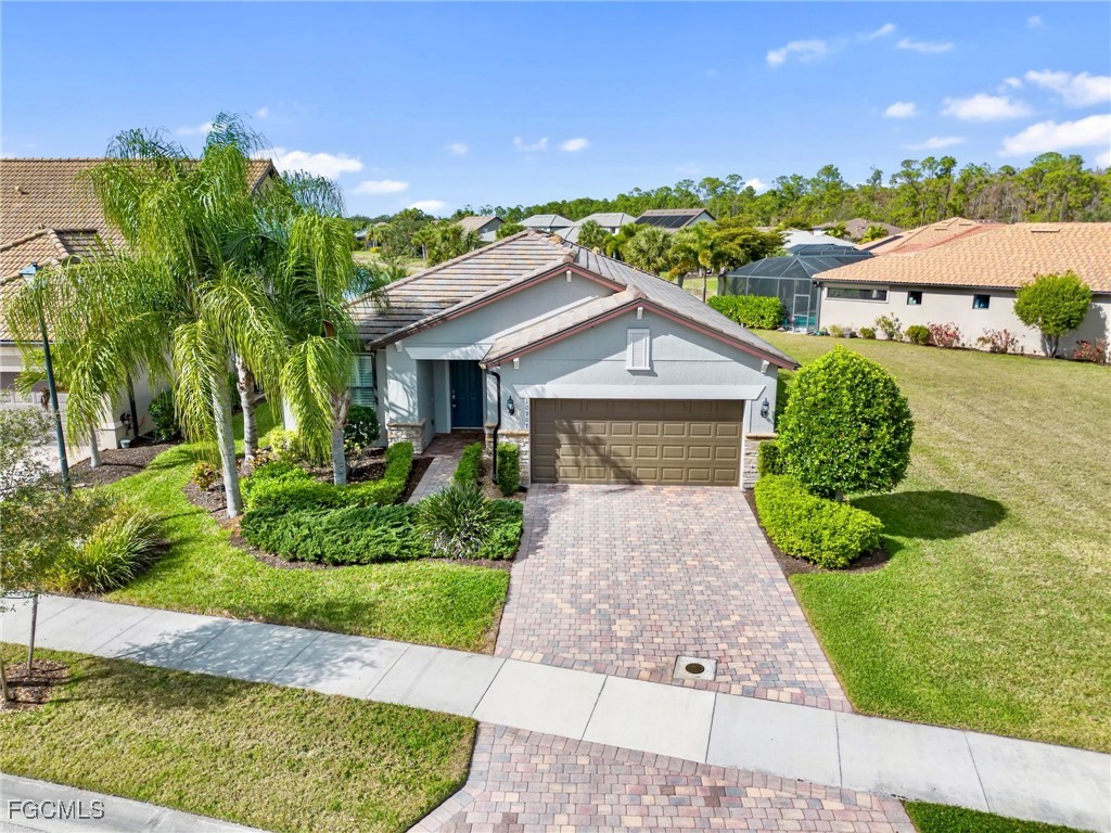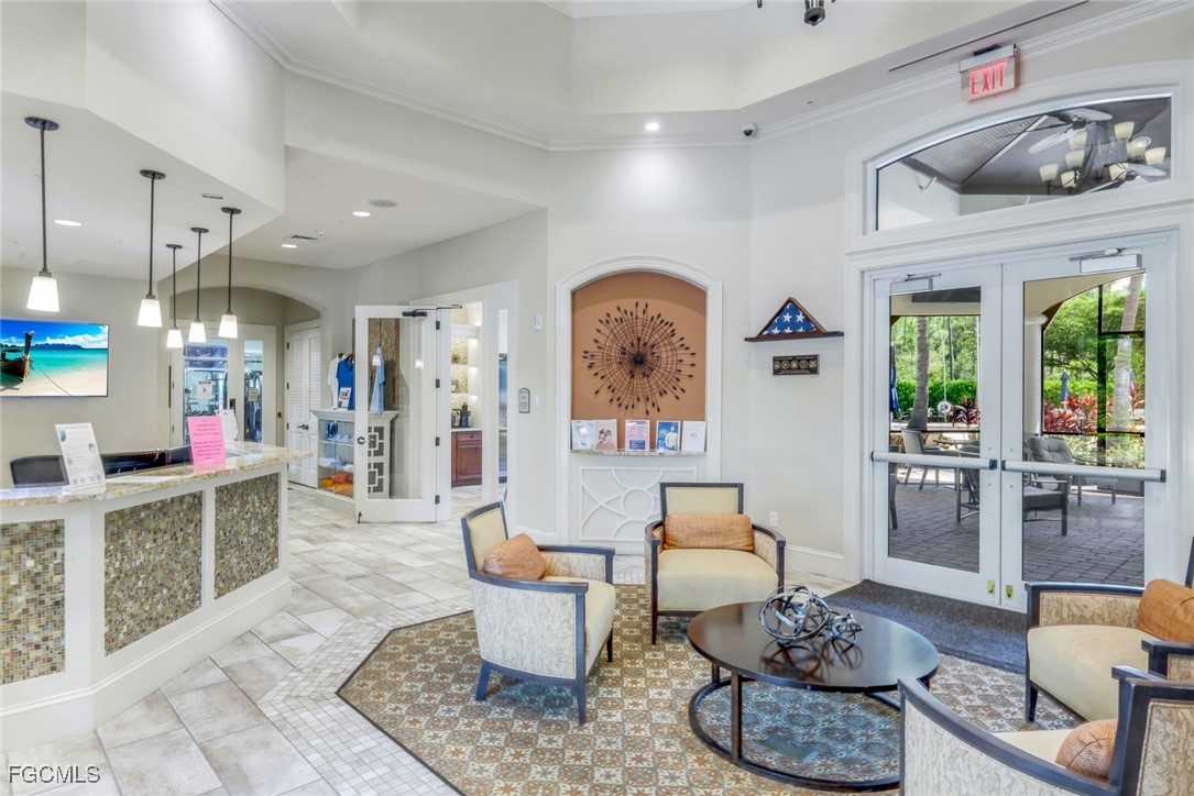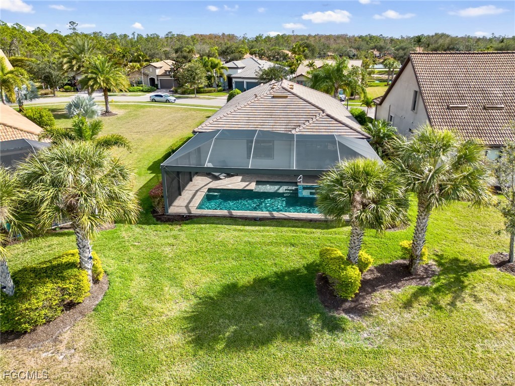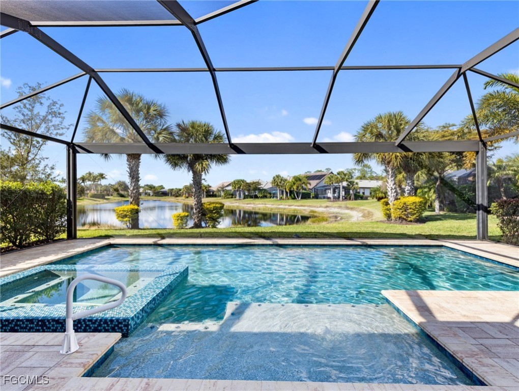 Experience the ultimate in Florida living with this beautifully appointed 3 bedroom plus den, 2 bath saltwater pool home, offering breathtaking long-range waterfront views. Spanning over 2,100 square feet, the home features elegant tile and wood flooring throughout, complemented by volume ceilings adorned with crown molding and plantation shutters. Stylized window coverings add a refined touch, creating an atmosphere of luxury and comfort. The thoughtfully designed floor plan provides both functionality and sophistication, with split bedrooms ensuring privacy and a versatile den enhanced by designer French doors. The butler pantry is equipped with a wine rack and a pocket door for added convenience. At the heart of the home, the spacious kitchen invites gatherings with a large center island, designer backsplash, pendant lighting, sleek neutral cabinetry, and high-end appliances—including a double oven and upgraded refrigerator. Recent updates include a new garbage disposal and all-new CO/Smoke alarms throughout for peace of mind. Additional features include a mudroom entryway with built-in cabinetry for extra storage, and a luxurious primary suite boasting a generous walk-in closet and an en-suite bath with dual sinks, separate soaking tub, and walk-in shower. Step outside to your private oasis and enjoy magical sunsets from the expansive, unobstructed picture screen pool cage. The heated saltwater pool with integrated spa is complemented by new LED lighting with customizable color options, perfect for evening relaxation. Just minutes away by golf cart or car, the amenity center offers a host of recreational activities: tennis, pickleball, bocce ball, fitness classes, gym workouts, lap swimming, or simply lounging by the pool. This residence offers a perfect blend of luxury, comfort, and resort-style living—welcome home!