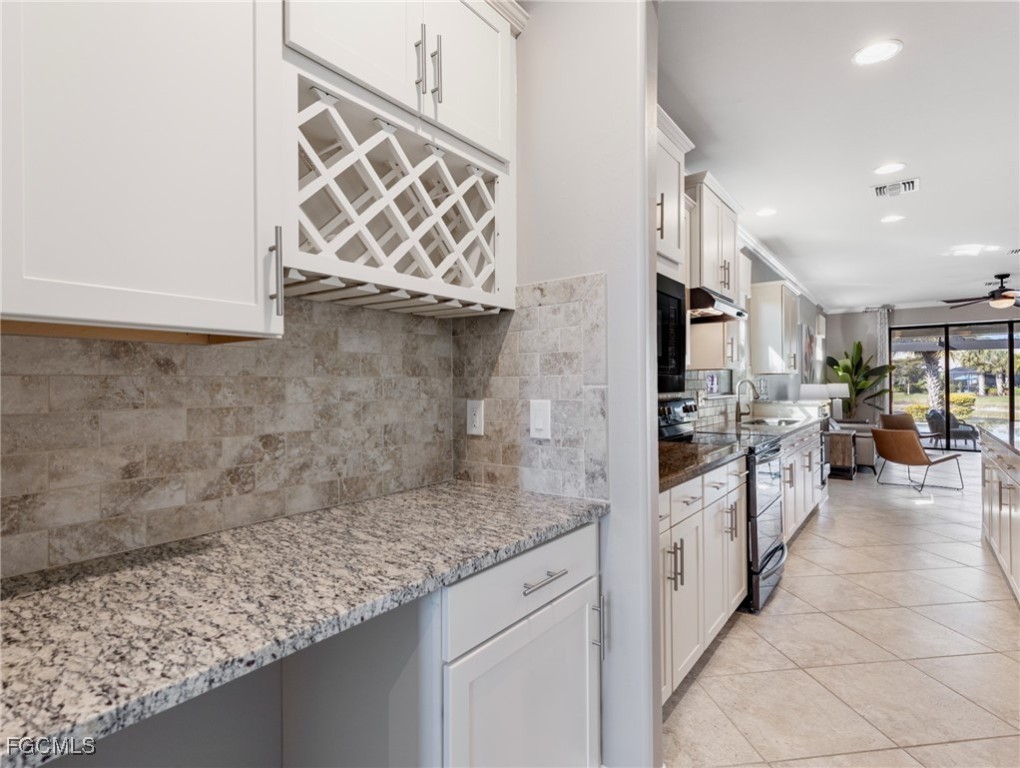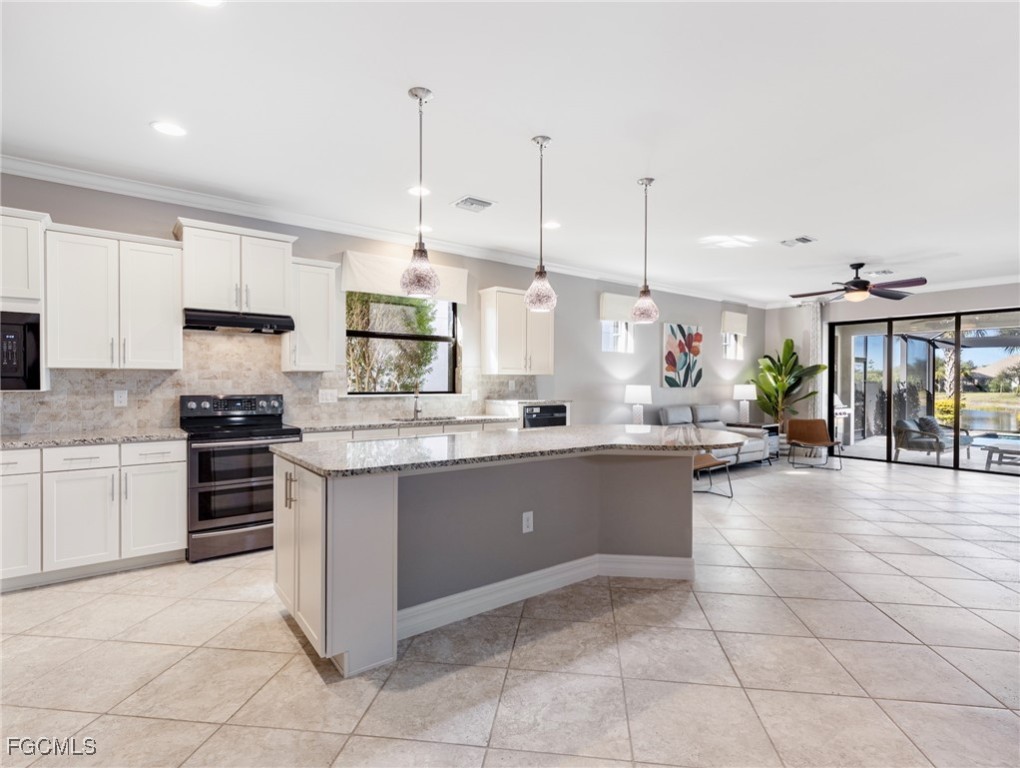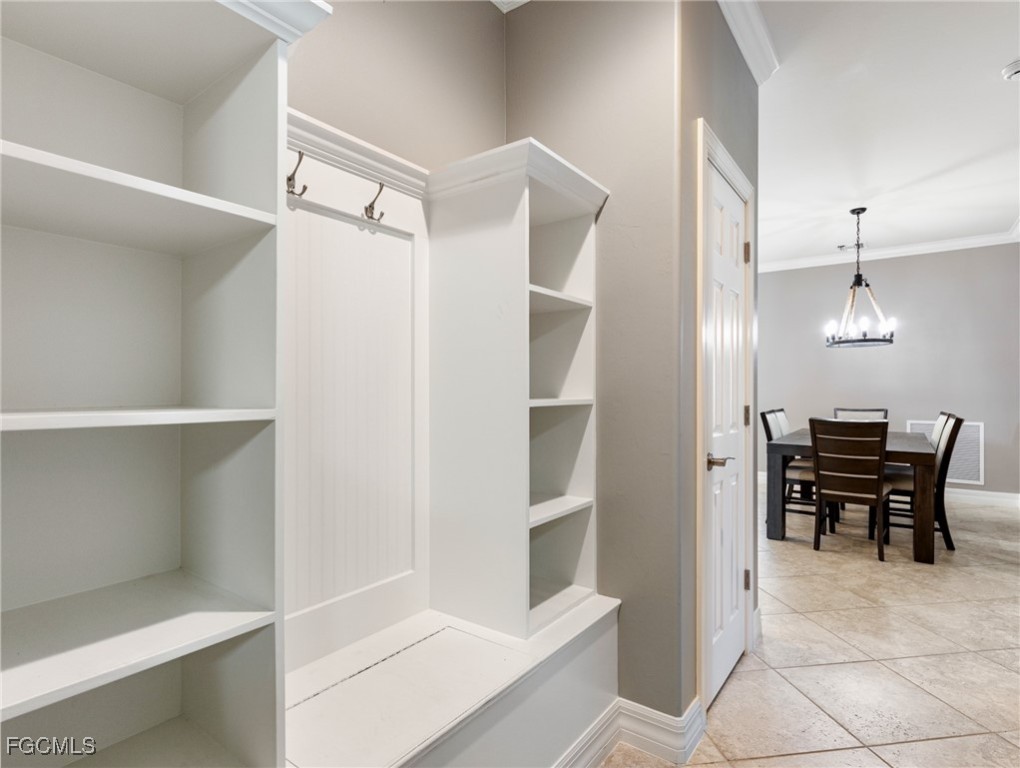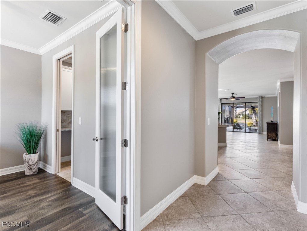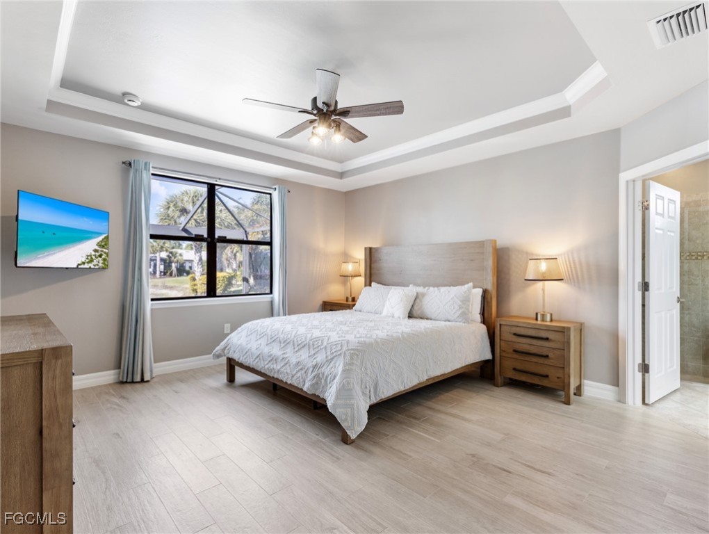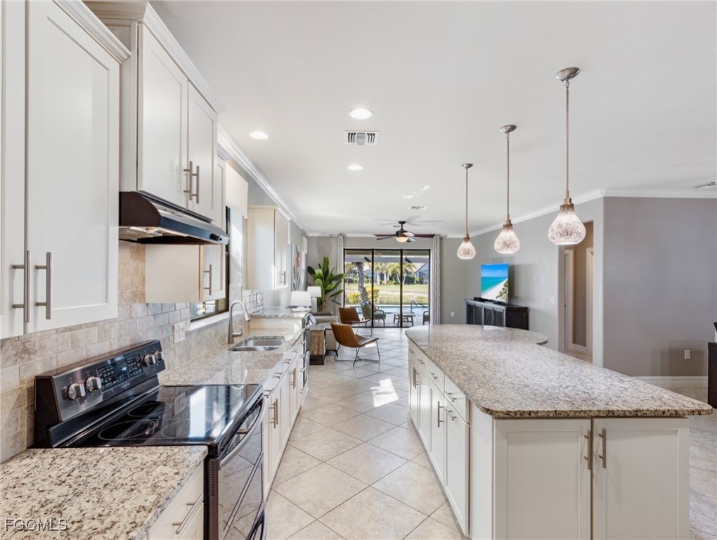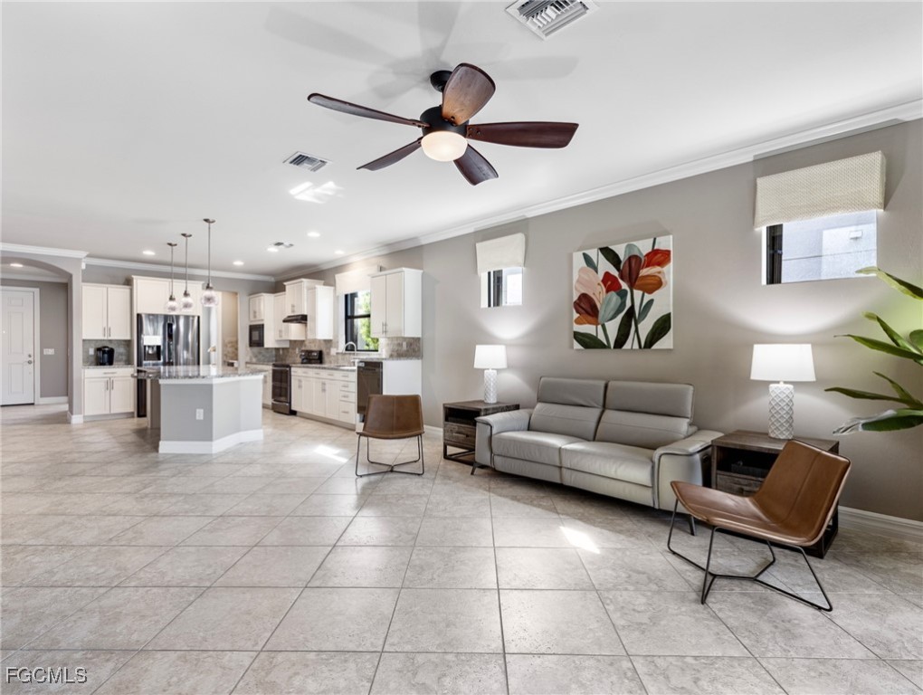 Experience the ultimate in Florida living with this beautifully appointed 3 bedroom plus den, 2 bath saltwater pool home, offering breathtaking long-range waterfront views. Spanning over 2,100 square feet, the home features elegant tile and wood flooring throughout, complemented by volume ceilings adorned with crown molding and plantation shutters. Stylized window coverings add a refined touch, creating an atmosphere of luxury and comfort. The thoughtfully designed floor plan provides both functionality and sophistication, with split bedrooms ensuring privacy and a versatile den enhanced by designer French doors. The butler pantry is equipped with a wine rack and a pocket door for added convenience. At the heart of the home, the spacious kitchen invites gatherings with a large center island, designer backsplash, pendant lighting, sleek neutral cabinetry, and high-end appliances—including a double oven and upgraded refrigerator. Recent updates include a new garbage disposal and all-new CO/Smoke alarms throughout for peace of mind. Additional features include a mudroom entryway with built-in cabinetry for extra storage, and a luxurious primary suite boasting a generous walk-in closet and an en-suite bath with dual sinks, separate soaking tub, and walk-in shower. Step outside to your private oasis and enjoy magical sunsets from the expansive, unobstructed picture screen pool cage. The heated saltwater pool with integrated spa is complemented by new LED lighting with customizable color options, perfect for evening relaxation. Just minutes away by golf cart or car, the amenity center offers a host of recreational activities: tennis, pickleball, bocce ball, fitness classes, gym workouts, lap swimming, or simply lounging by the pool. This residence offers a perfect blend of luxury, comfort, and resort-style living—welcome home!