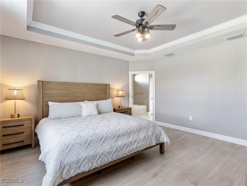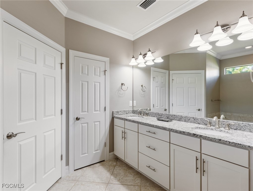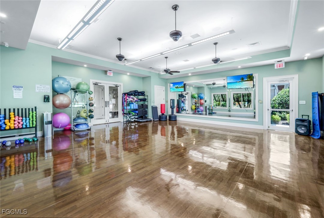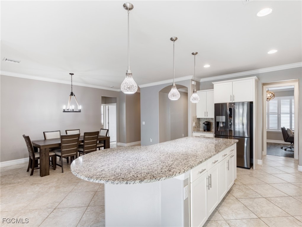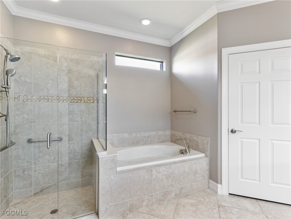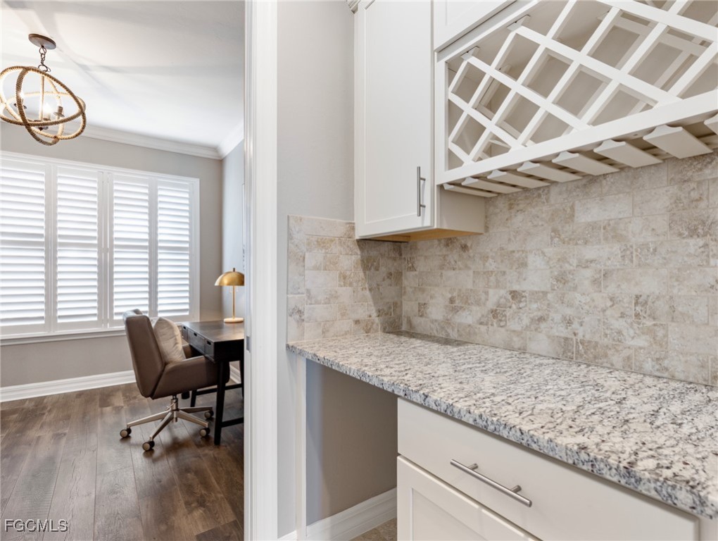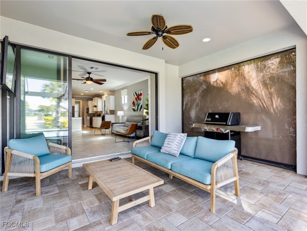 Experience the ultimate in Florida living with this beautifully appointed 3 bedroom plus den, 2 bath saltwater pool home, offering breathtaking long-range waterfront views. Spanning over 2,100 square feet, the home features elegant tile and wood flooring throughout, complemented by volume ceilings adorned with crown molding and plantation shutters. Stylized window coverings add a refined touch, creating an atmosphere of luxury and comfort. The thoughtfully designed floor plan provides both functionality and sophistication, with split bedrooms ensuring privacy and a versatile den enhanced by designer French doors. The butler pantry is equipped with a wine rack and a pocket door for added convenience. At the heart of the home, the spacious kitchen invites gatherings with a large center island, designer backsplash, pendant lighting, sleek neutral cabinetry, and high-end appliances—including a double oven and upgraded refrigerator. Recent updates include a new garbage disposal and all-new CO/Smoke alarms throughout for peace of mind. Additional features include a mudroom entryway with built-in cabinetry for extra storage, and a luxurious primary suite boasting a generous walk-in closet and an en-suite bath with dual sinks, separate soaking tub, and walk-in shower. Step outside to your private oasis and enjoy magical sunsets from the expansive, unobstructed picture screen pool cage. The heated saltwater pool with integrated spa is complemented by new LED lighting with customizable color options, perfect for evening relaxation. Just minutes away by golf cart or car, the amenity center offers a host of recreational activities: tennis, pickleball, bocce ball, fitness classes, gym workouts, lap swimming, or simply lounging by the pool. This residence offers a perfect blend of luxury, comfort, and resort-style living—welcome home!