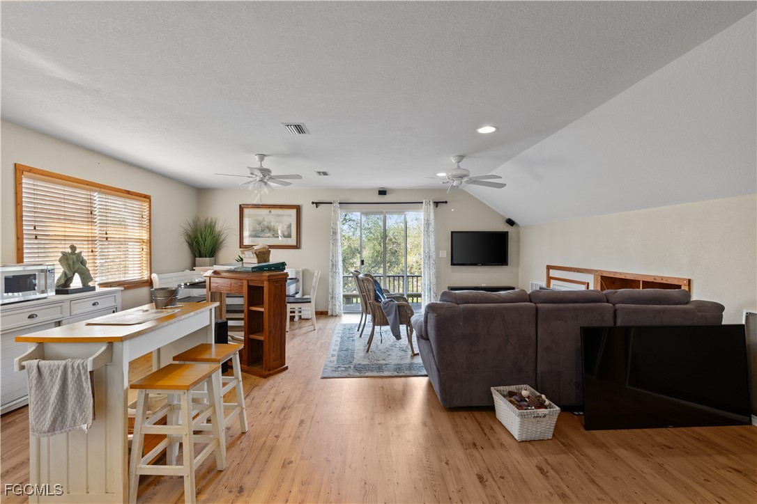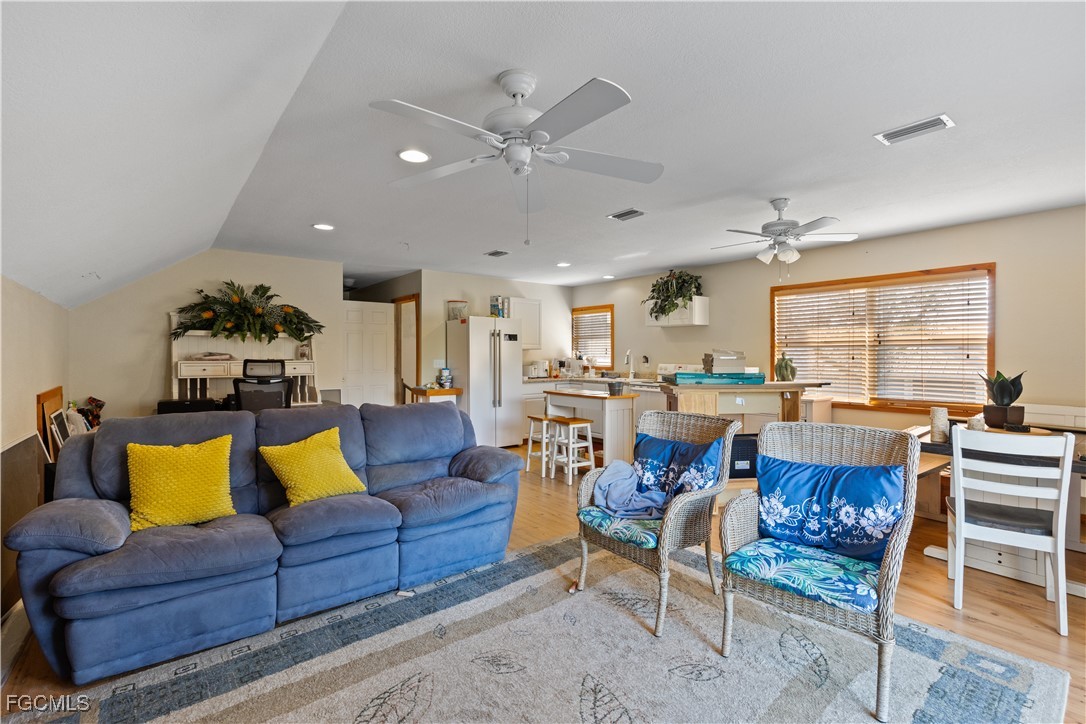 The 1,951 sq ft main residence features an open, light-filled 3-bedroom, 2-bath floor plan, designed for effortless living and entertaining. The breakfast nook and living areas overlook serene backyard and canal views. Step outside to an expansive screened, brick-paver patio with a fully equipped outdoor kitchen, creating an ideal waterfront entertaining space.