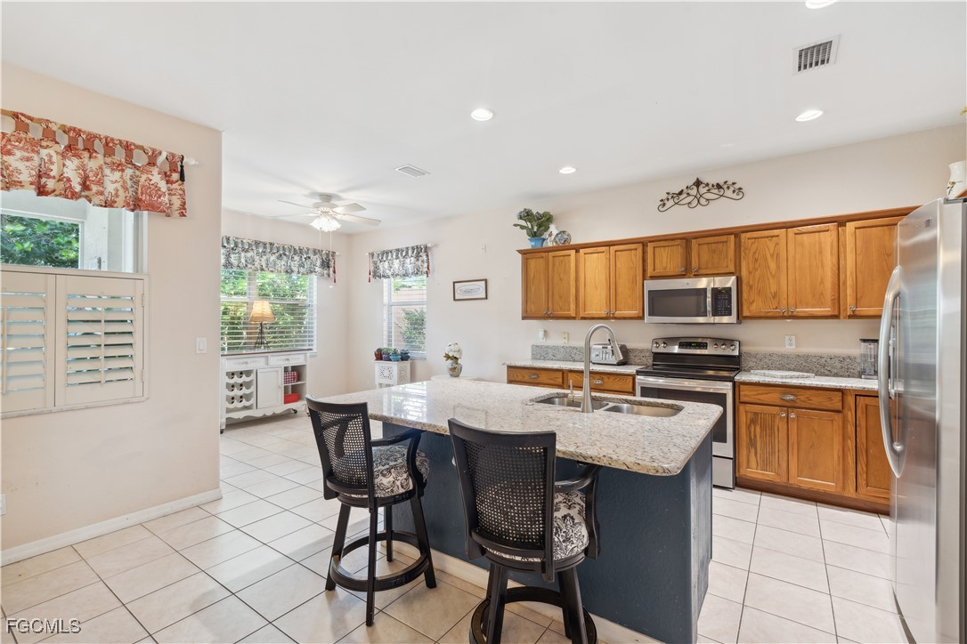 Welcome to this beautiful residence in the highly desirable Timber Lake community at Three Oaks, where modern living meets everyday comfort. Offering 4 bedrooms, 2.5 bathrooms, and a flexible upstairs den or bonus room that overlooks the open living space below, this home is thoughtfully designed to accommodate a variety of lifestyles. The contemporary kitchen is a standout, featuring granite countertops, stainless steel appliances, and a spacious island perfect for cooking, casual dining, or entertaining guests. Sun-filled dining and living areas flow seamlessly together, enhanced by large windows that create a bright and welcoming atmosphere. The primary suite is a true retreat, complete with a walk-in closet and a spa-inspired en-suite bathroom with dual vanities, a jacuzzi tub, and generous space to unwind. Three additional bedrooms offer versatility for family, visitors, or a home office. Step outside to your own private backyard escape, where an extended covered patio provides the ideal setting for outdoor dining, gardening, or relaxing under the Florida sun. Recent updates include a new roof (2024), hurricane-impact windows on the second floor, and a propane tank with whole-house hookup currently servicing the gas fireplace—allowing for easy conversion of the stove if desired—adding both charm and flexibility. Residents of Timber Lake enjoy access to community amenities such as a resort-style pool, playground, and scenic walking trails, all while being conveniently located just minutes from I-75 and Gulf Coast Town Center’s shopping, dining, and entertainment. This exceptional home offers the perfect balance of tranquility and accessibility—schedule your private showing today.