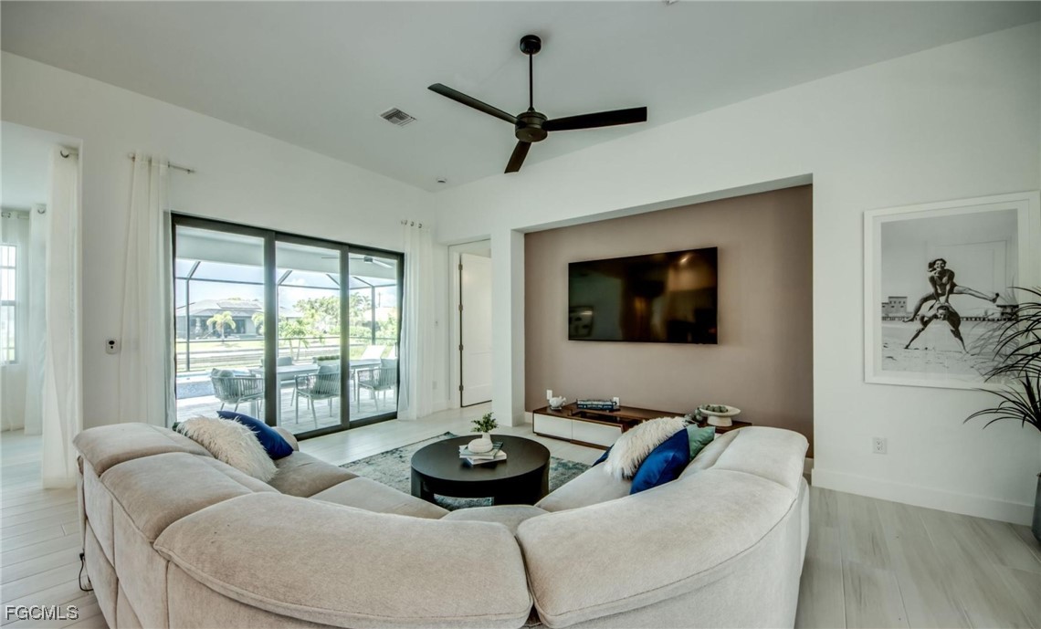 Brand new WATERFRONT POOL HOME in SW Cape Coral with SOUTHERN rear exposure situated on an OVERSIZED LOT. This gorgeous property was just completed (2025) , offers 3 bedrooms plus DEN, 2 bathrooms and an open living concept on almost 2000 SFT. The hurricane impact sliding glass doors open to the spacious paved pool deck with lanai and electric heated pool w/ Jacuzzi and custom upgrades. More features include: Porcelain tile trough-out, design light fixtures, elegant quartz counter tops, custom cabinetry, custom mirrors, epoxy flooring in garage and an upgraded landscape package. Conveniently located close to shopping and dining. Please also see virtual tour! This Property is not located in a flood zone!