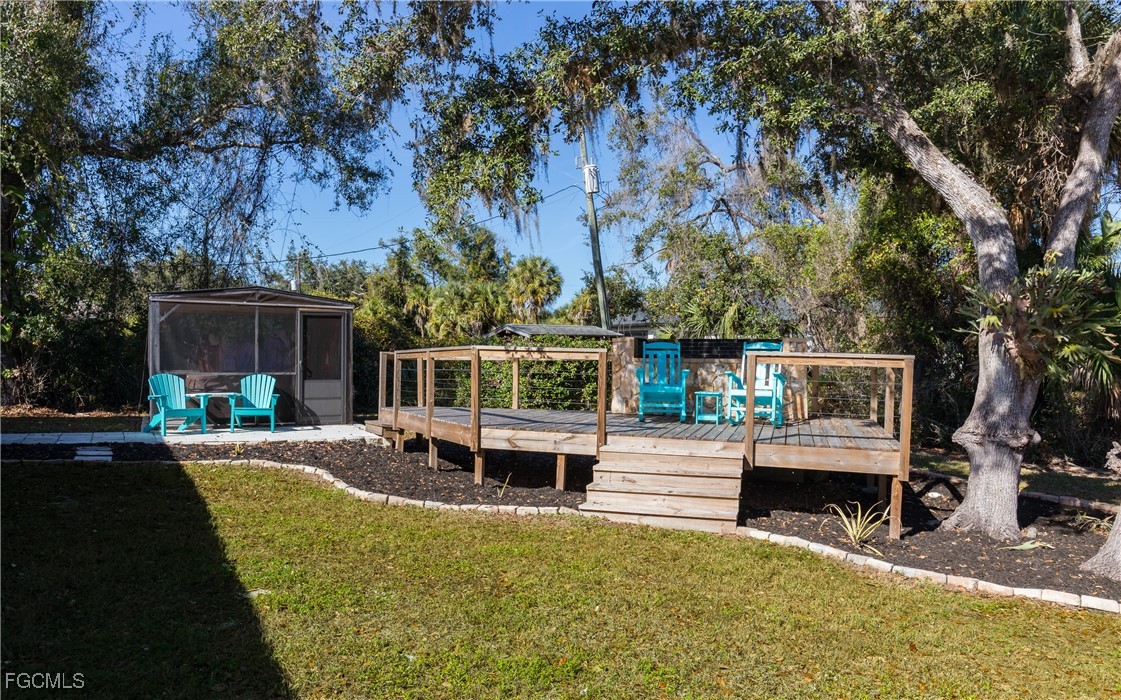 The expansive backyard serves as an entertainment haven, complete with a WOODEN DECK, wood-burning STONE GRILL, and an enclosed/screened Bullfrog HOT TUB. The home boasts a fully REMODELED KITCHEN equipped with newer stainless steel appliances, updated bathrooms, and TILE FLOORING throughout. Additionally, it features a CENTRAL VAC system for both the house and outbuilding.