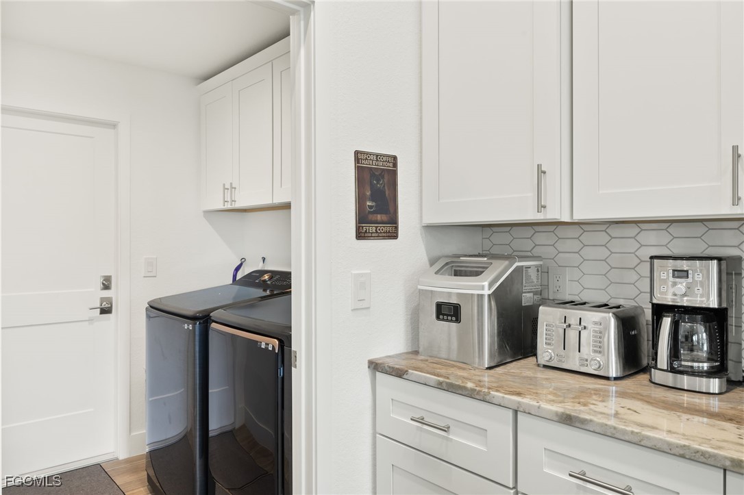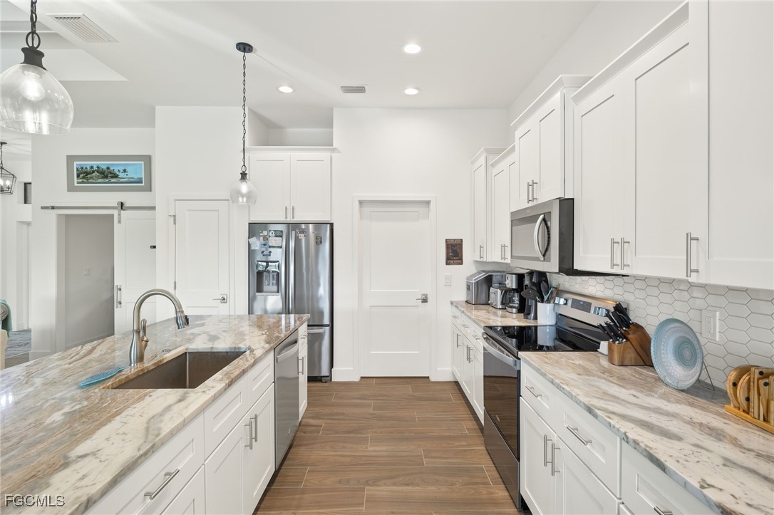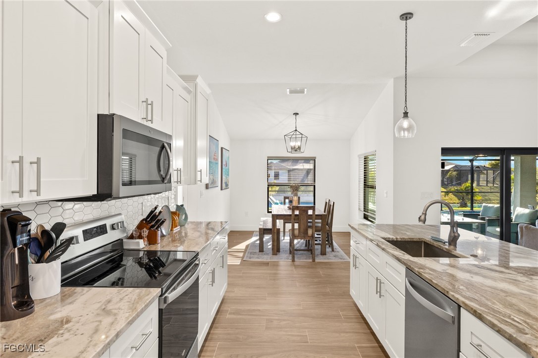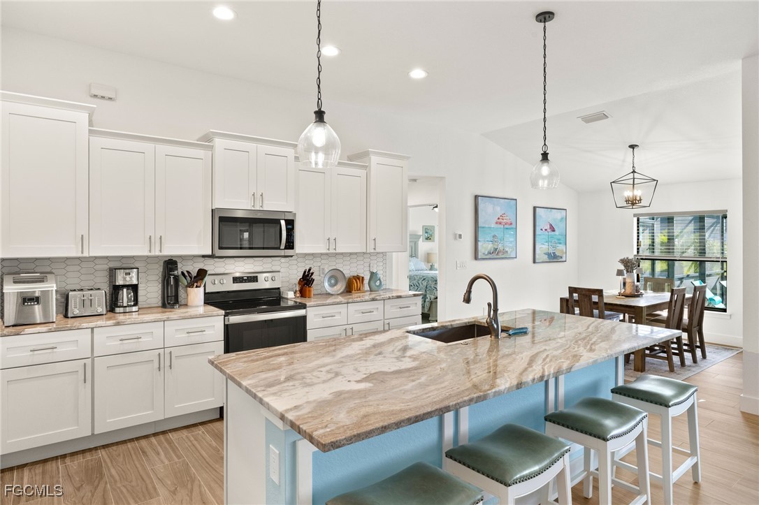 The bright interior includes 3 bedrooms plus a versatile den/office with a stylish sliding barn door. The open-concept kitchen is anchored by an oversized beach-inspired granite island with seating for four, complemented by stainless steel appliances, ample cabinetry, and generous prep space.