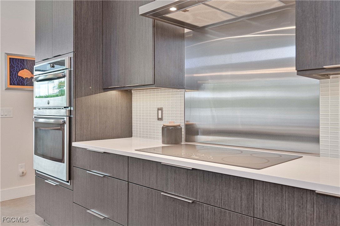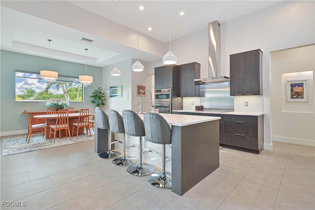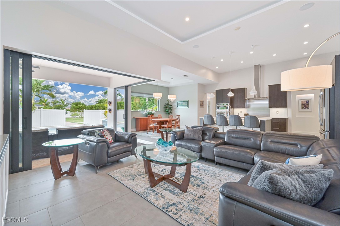 The gourmet kitchen is a chef’s dream, showcasing upgraded cabinetry, an extended quartz island, Top Zero sink, induction cooktop with a custom-built exhaust hood, built-in microwave and oven, all premium appliances, and a reverse-osmosis drinking water system. The living area features disappearing corner sliders that fully open to the lanai, creating a true indoor/outdoor lifestyle. Large porcelain tile throughout the entire open-concept living space.