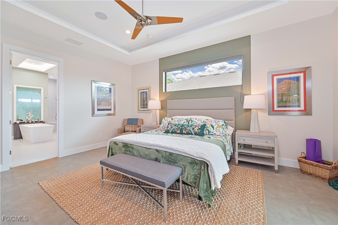 The primary suite serves as a serene private retreat with a large walk-in closet, spa-inspired bathroom with a floating double vanity, a free-standing soaking tub, and a spacious walk-in shower with custom finishes. Tray ceilings add elegance throughout the home.