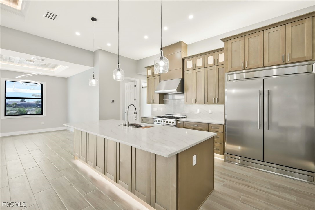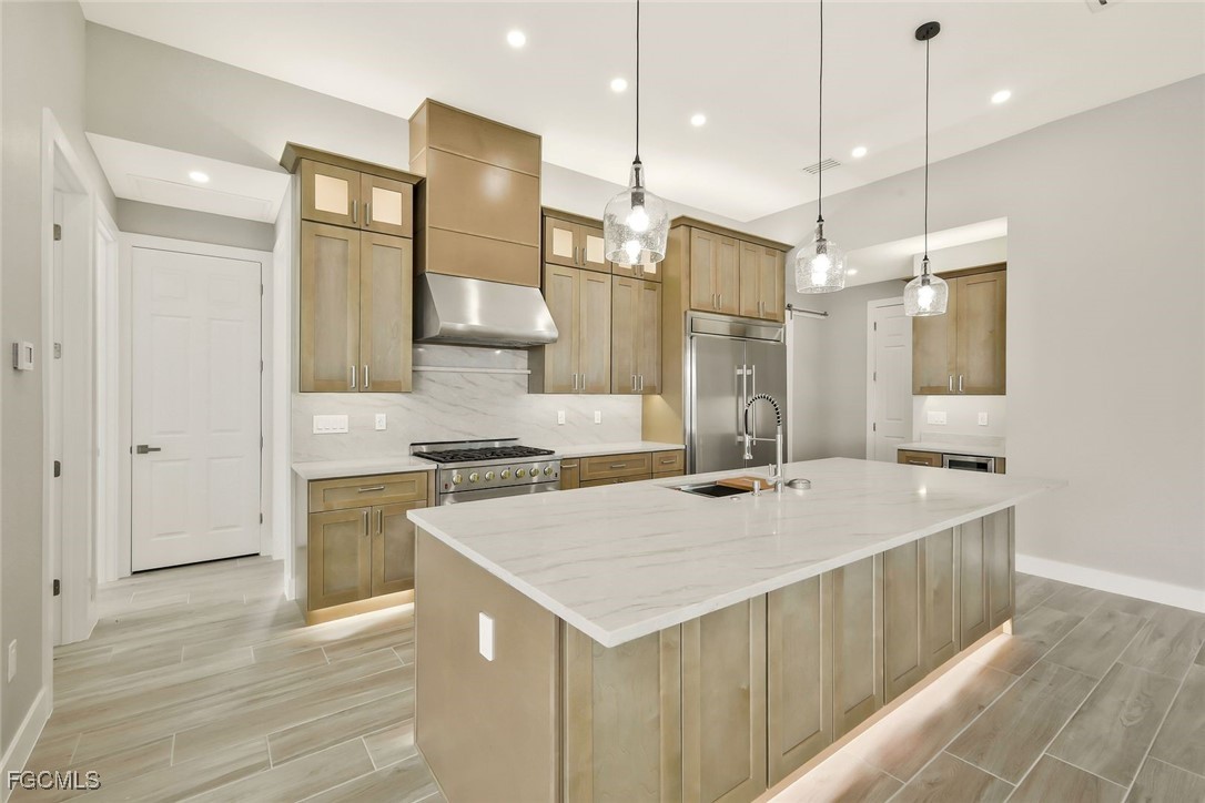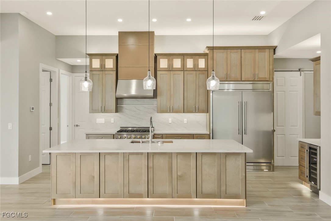 with professional hood vent, giant 60” pro refrigerator and freezer. There is a wine cooler and a