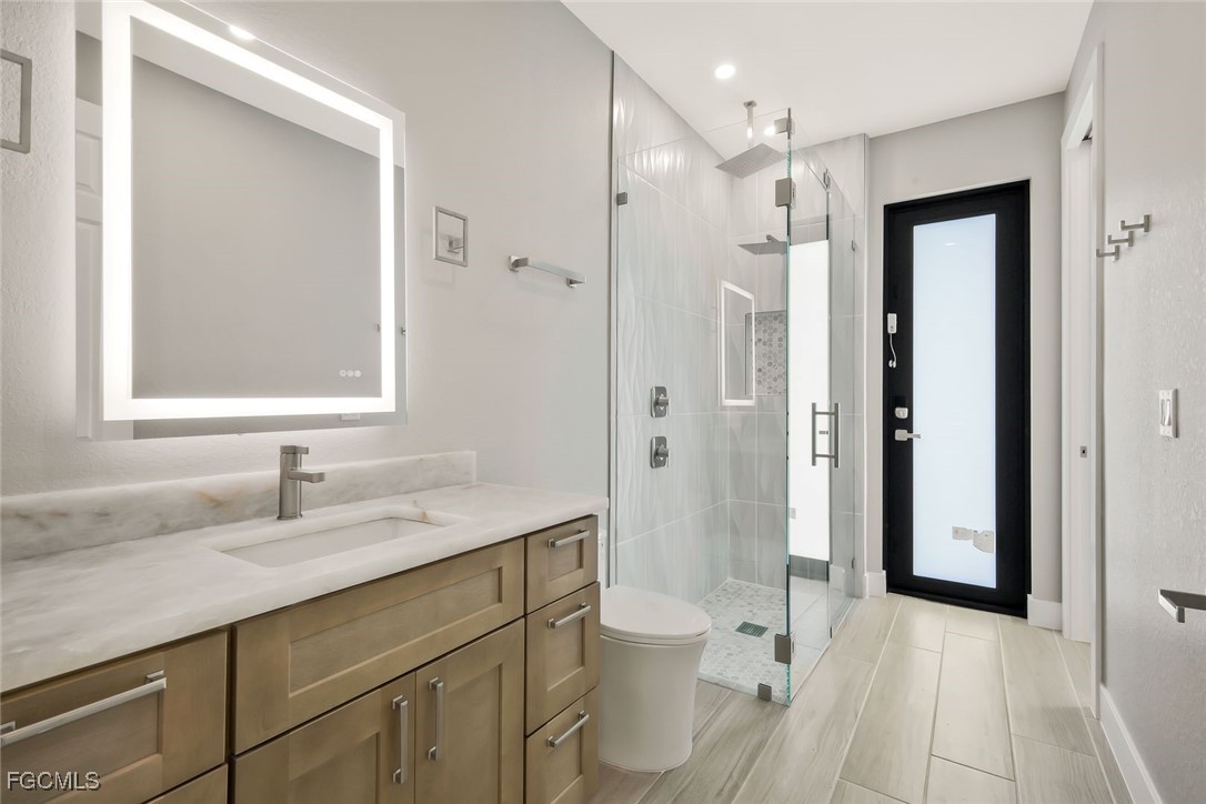 home. The guest bathroom offers convenient access to patio and pool, ideal for indoor-outdoor