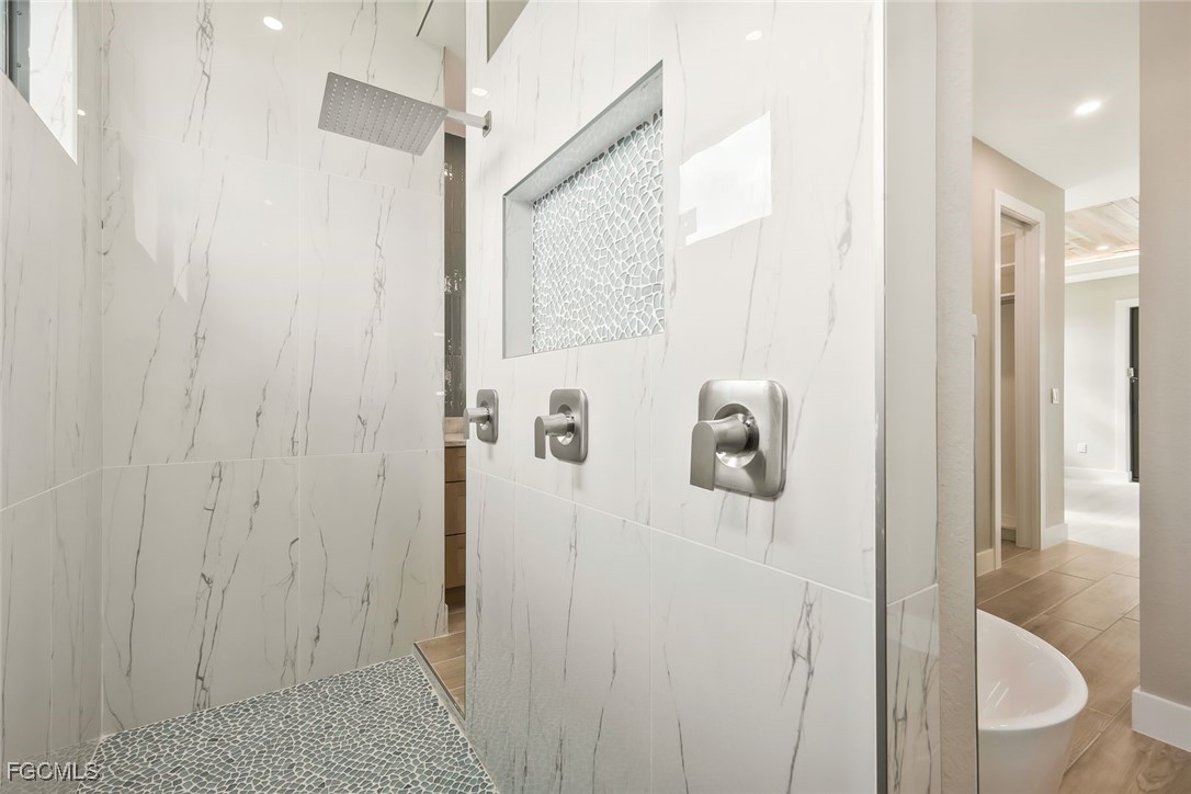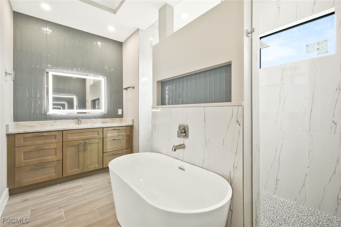 alone soaking tub, expansive walk-around shower with dual shower heads and a large rain