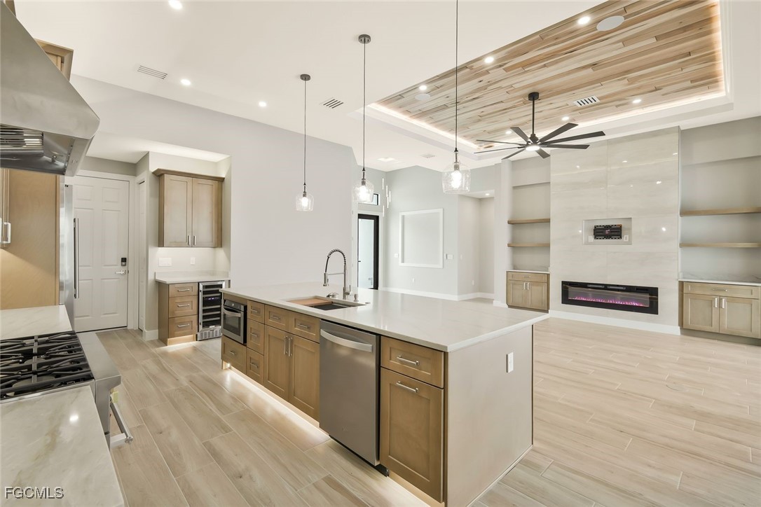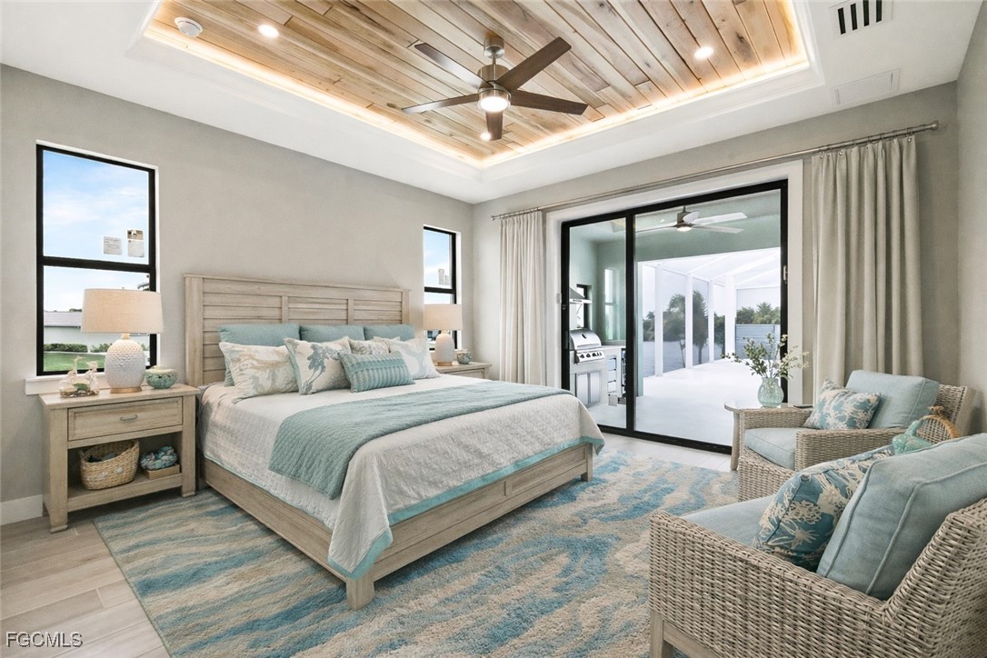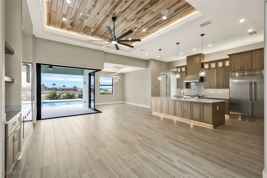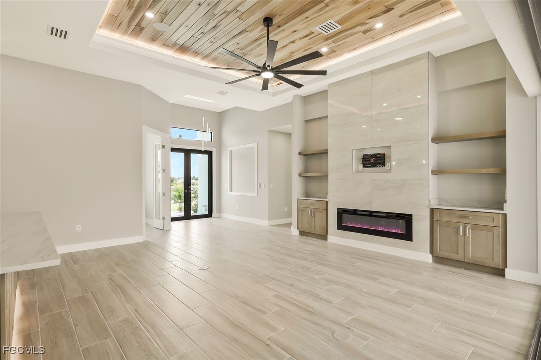 by stunning tray ceilings throughout with exotic hardwood featuring indirect LED lighting. The