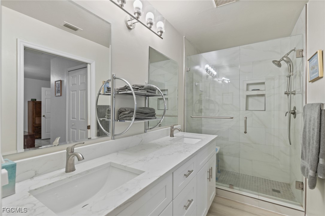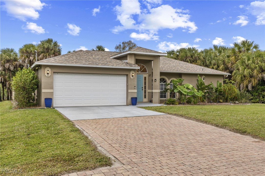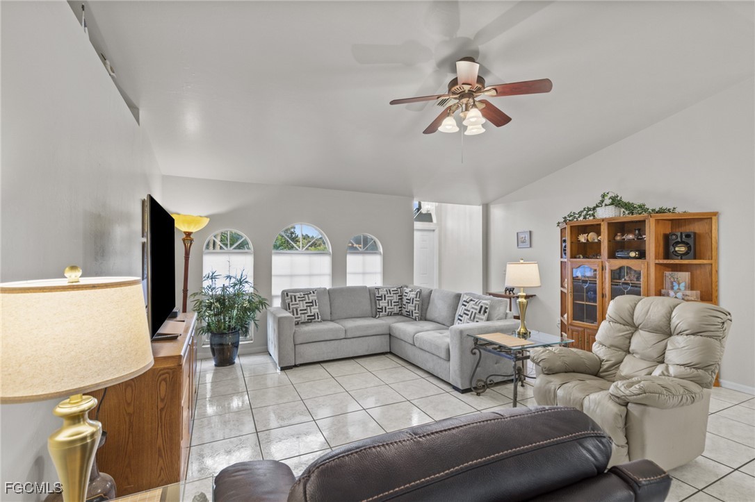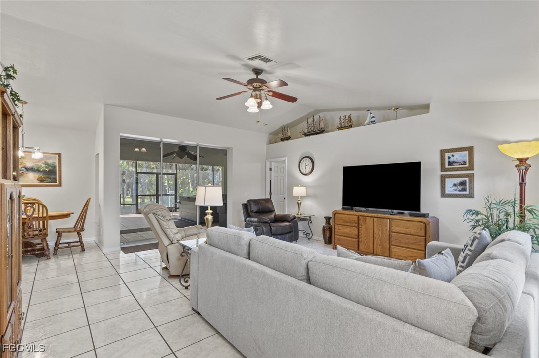 Inside, the home is light and bright with soaring cathedral ceilings, a spacious living area, and arched windows that bring the outdoors in. The updated kitchen offers ample storage and flows into the adjacent dining area, making everyday living and hosting easy. A split bedroom floor plan provides separation, with the spacious primary bedroom offering direct access to the lanai and an updated ensuite with dual vanities and a walk in shower. Two additional bedrooms share a full bathroom.