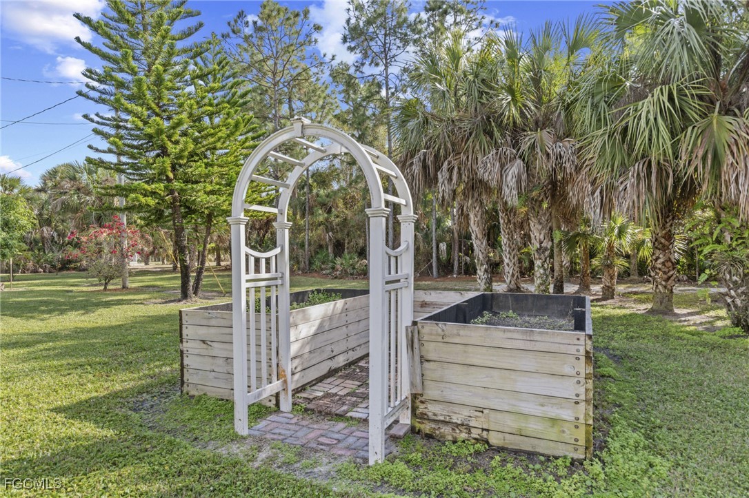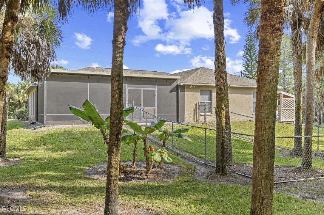 Outdoors is where this property truly shines. A stocked fish pond with a dock and water display creates a peaceful focal point and attracts abundant wildlife, including deer and water birds. Walking trails wind throughout the property, offering space to explore and enjoy the natural surroundings. The recently rescreened lanai provides panoramic views of the pond and grounds and includes an above ground hot tub, ideal for relaxing. A partially fenced yard, mature fruit trees including banana, papaya, coconut, and royal palm trees, and a high elevation setting with no flood insurance required complete the setting.