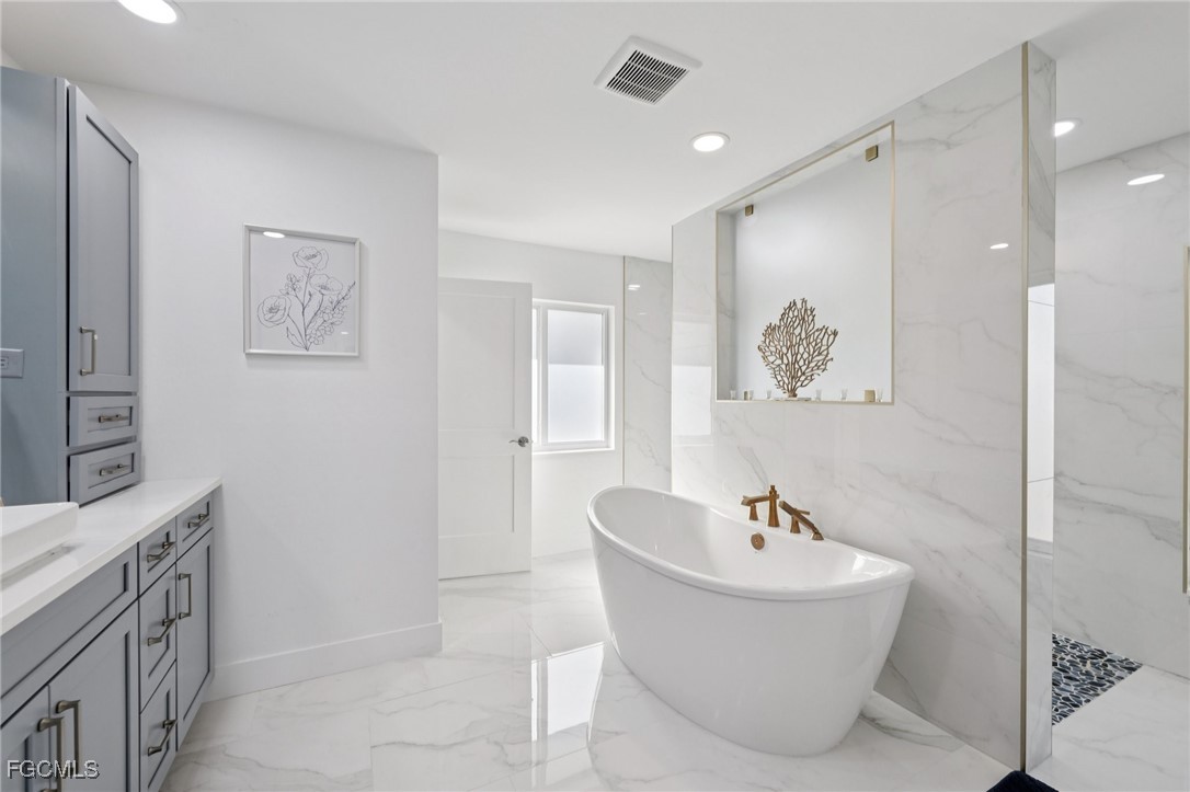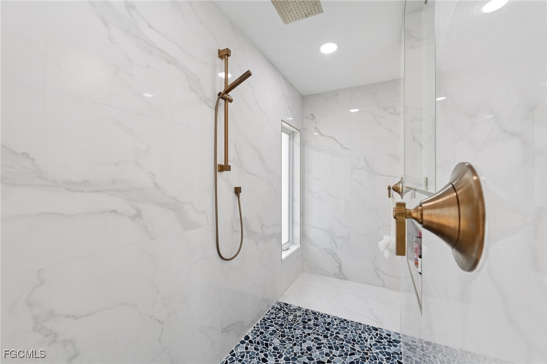 The home features four bedrooms. The spacious primary suite offers a large walk-in closet and a spa-like primary bathroom designed for relaxation, featuring a beautifully executed walk-around shower. Interior highlights include recessed LED lighting throughout, all Wi-Fi controlled via Alexa or Google with customizable colors and ambiance, along with quartz countertops and elegant white marble-style flooring.