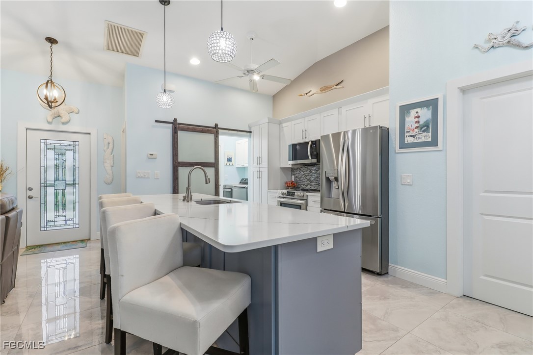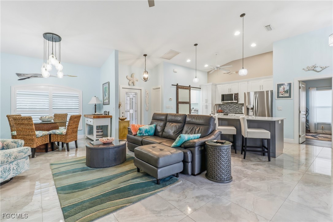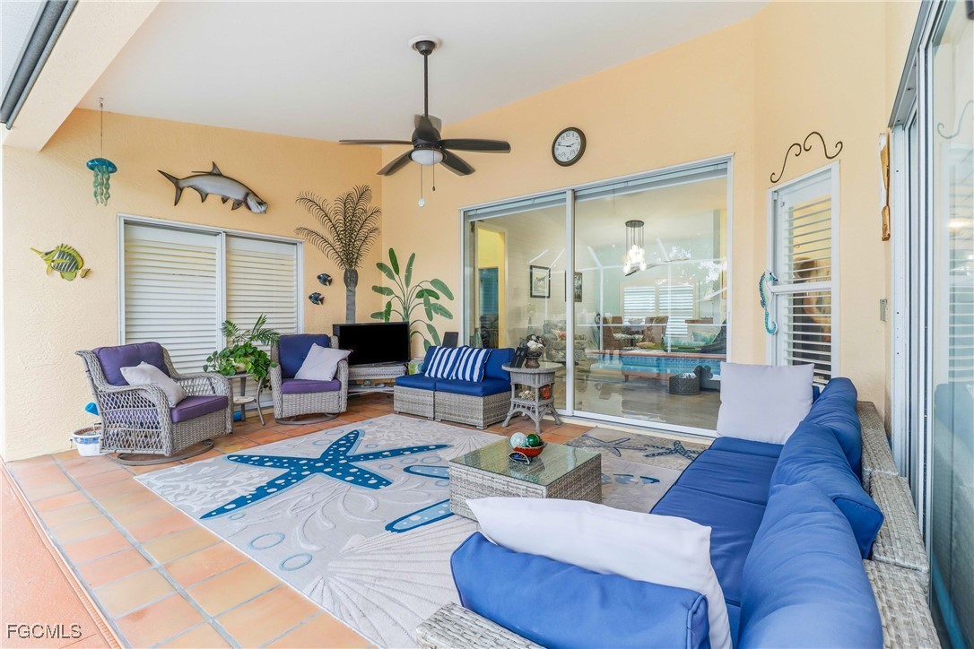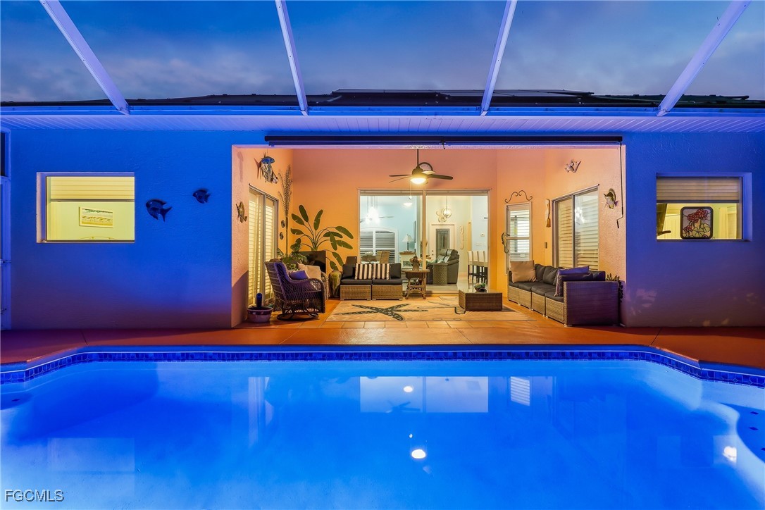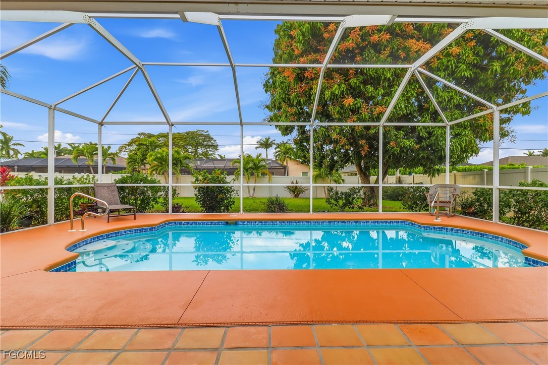 The Rose garden is one of Cape Coral's most highly sought after neighborhoods. Offering a relaxing, peaceful, and prestigious location and setting you around some of the best areas in Cape Coral. Having a home in the Rose Garden means you will be able to enjoy the best of what Cape Coral has to offer. Giving you a sense of what it is really like to live in South Florida. For starts this home has Impact resistant windows and a newer roof to save you on home owners insurance. Where Location meets luxury, this home right as you enter will greet you with high end large tile that follow through the main areas of the house.Custom Plantation shutters and shades. Also custom electric electric shades in living area and with shiplap walls in living area and primary owners suite along with nice sitting area. Nice accent of Wood look LVP in the rooms , the home holds Florida Charm and character. Moving into the Kitchen you will find a fully updated Kitchen with coffee bar boasting a modern style while still keeping the South Florida Vibes people seek in the area. You won't be disappointed with your backyard. The pool is large and has lighting, so you can expect to be tempted to go for an evening swim. Unlike smaller lots where the pool takes up the whole backyard , you not only have a pool, but a backyard to garden with Large fruitful mature Mango tree and play with the family and an area to relax and dine before arriving to your pool. Backyard is fully fenced. You can expect to save money on your energy bills with Solar panels handling your Electricity. The front allows for additional parking as you have a 3 Car garage and additional space for other parking in the driveway and left side gate allows space to pull in Recreational Mobiles. The front has beautfiul landscaping giving you the enjoyable tropical feelings and a place to get excited about coming home to. With professionally installed pavers the driveway offers you modern high-end style that gives your house the character it deserves . Tarpon Pointe Marina and dining just down the road. Please call today to schedule your showing.