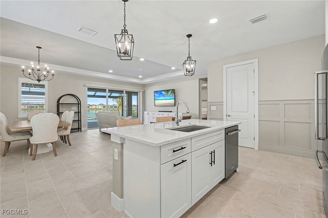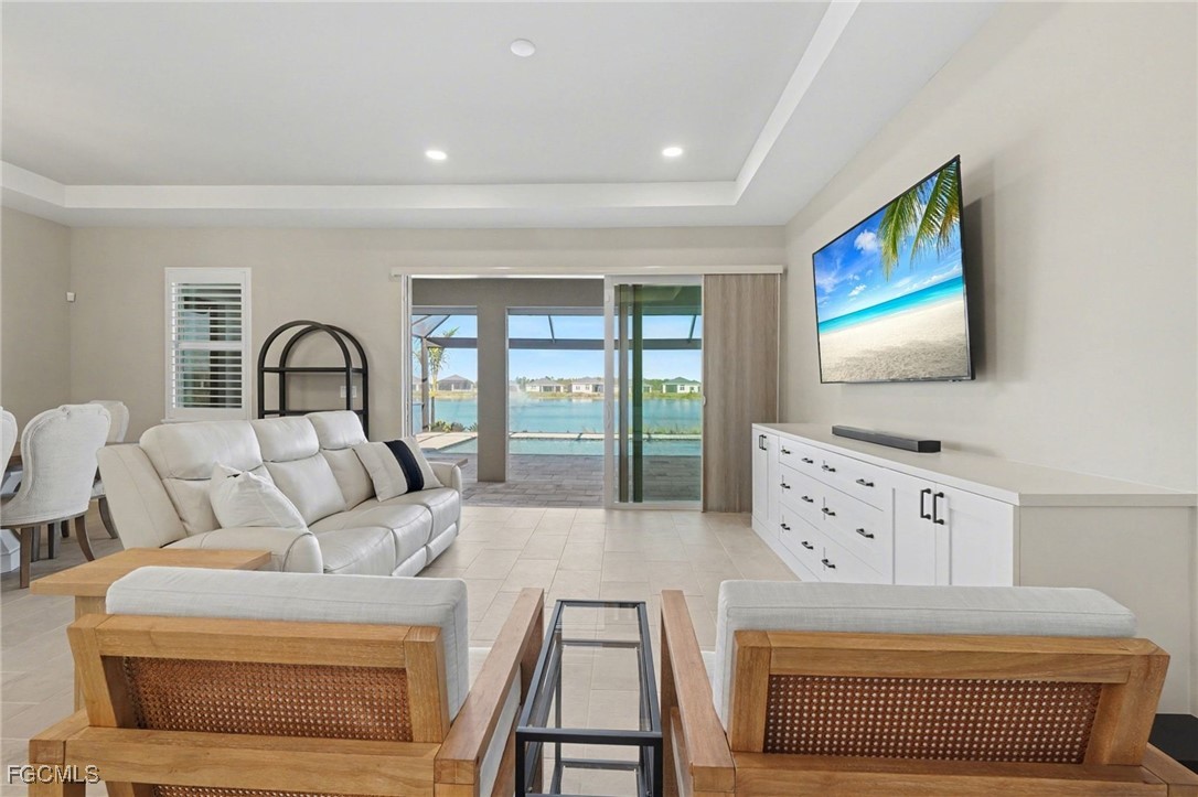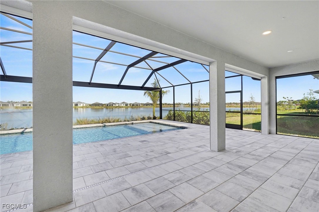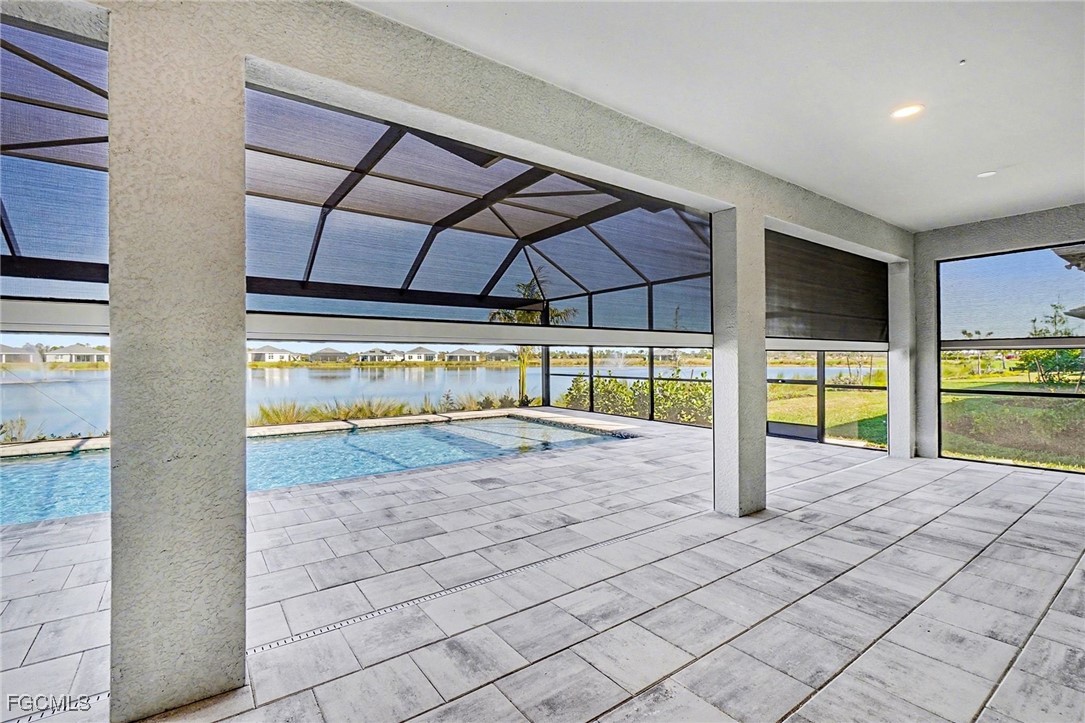 Just beyond the open great room, discover a private outdoor oasis. The newly added saltwater heated pool with autofill creates the perfect retreat for relaxing or entertaining friends and family. The extended lanai features a picture-frame screen, allowing unobstructed views of the tranquil water view and fountains, along with breathtaking Florida sunsets. Motorized hurricane screens add both safety and privacy.