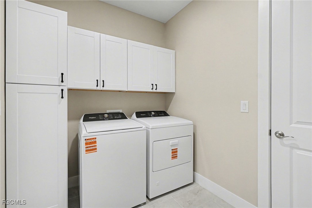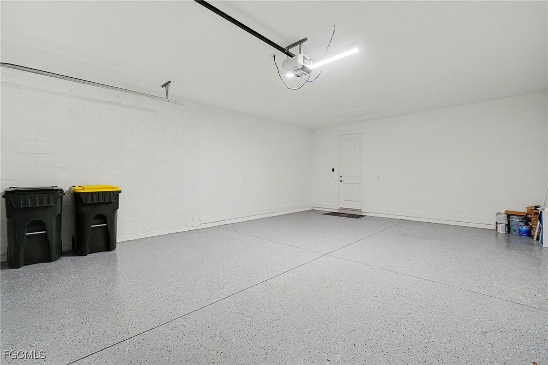 Additional highlights include a large laundry room with built-in cabinetry, and a two-car garage with an epoxy-coated floor, offering space for a large SUV, golf cart, and extra storage or workspace.