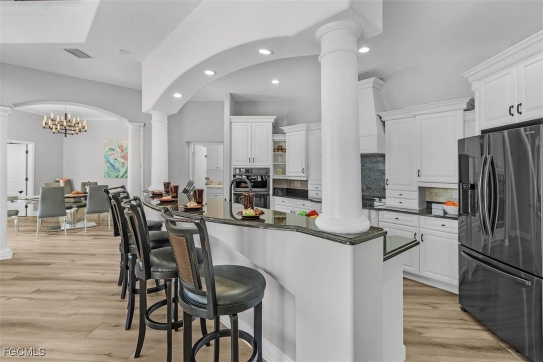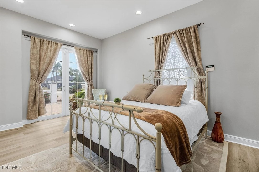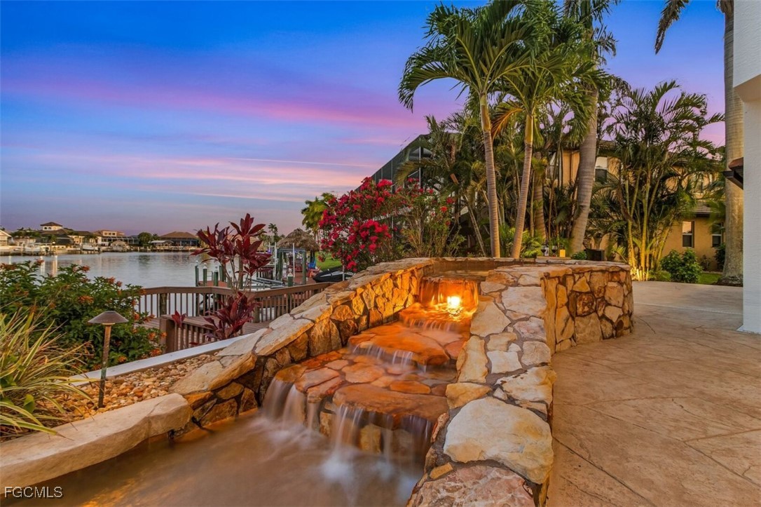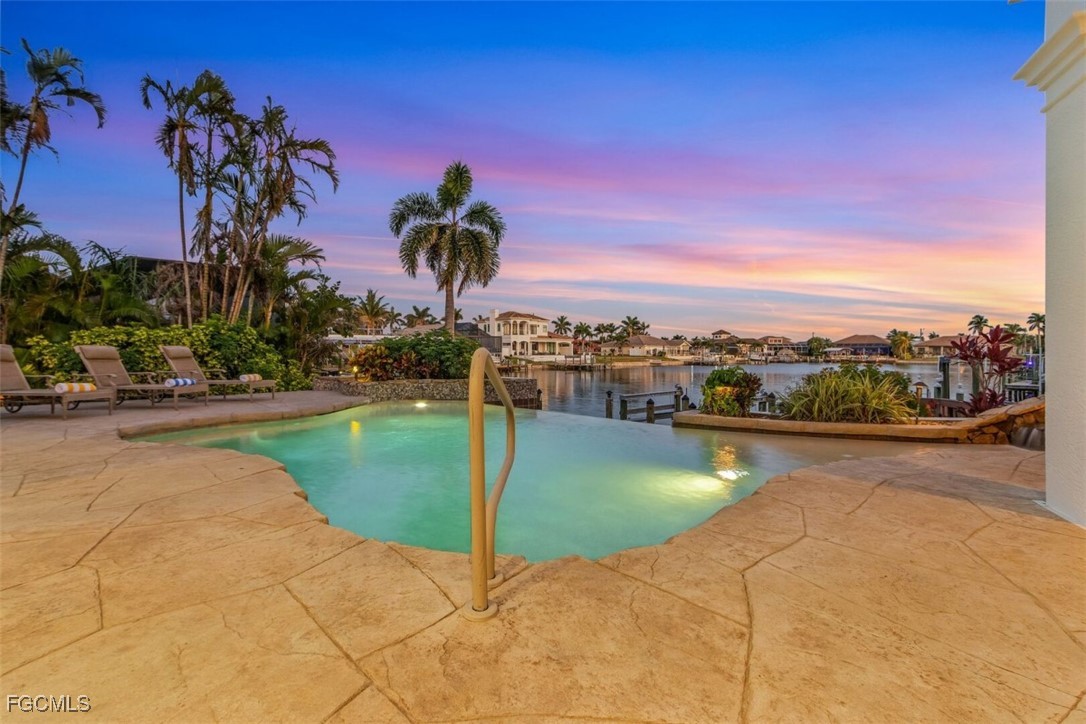 Rare Gulf access Basin Views from this 4,500 SF Home with one of the largest Gulf Access Lots in SW Cape Coral. A .61 Acre corner lot allows room to expand, add an RV garage, tennis, pickleball or basketball court or guest house. Build by prestigious Aubuchon Homes to be their Casa Palermo Model Home this house has been enhanced with over $300,000 in remodeling and improvements. New Roof and recently remodeled with a modern color palette, wood floors, and 2024 renovated master suite and bathroom! Featuring 4 bedrooms, 5 bathrooms and an open floor plan overlooking WIDE WATER VIEWS and Vanishing Edge Pool with Southern Exposure! Entertain friends and family in the 2 story living room with big cornering sliding glass doors leading to the pool. Double-sided fireplace and large outdoor entertainment space with an outdoor kitchen area. Lavish Kitchen with high end appliances , bar top, and formal dinning. Sold Furnished! Outdoor oasis with a huge private lanai with a vanishing pool edge.