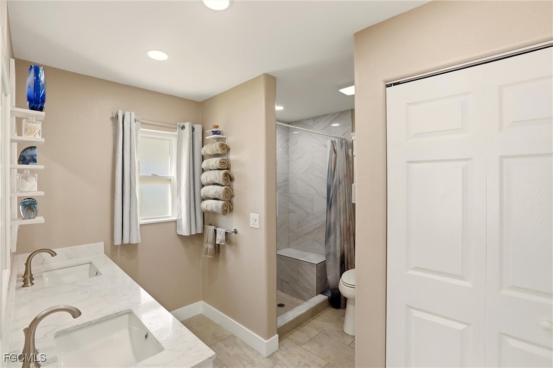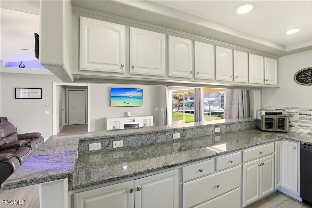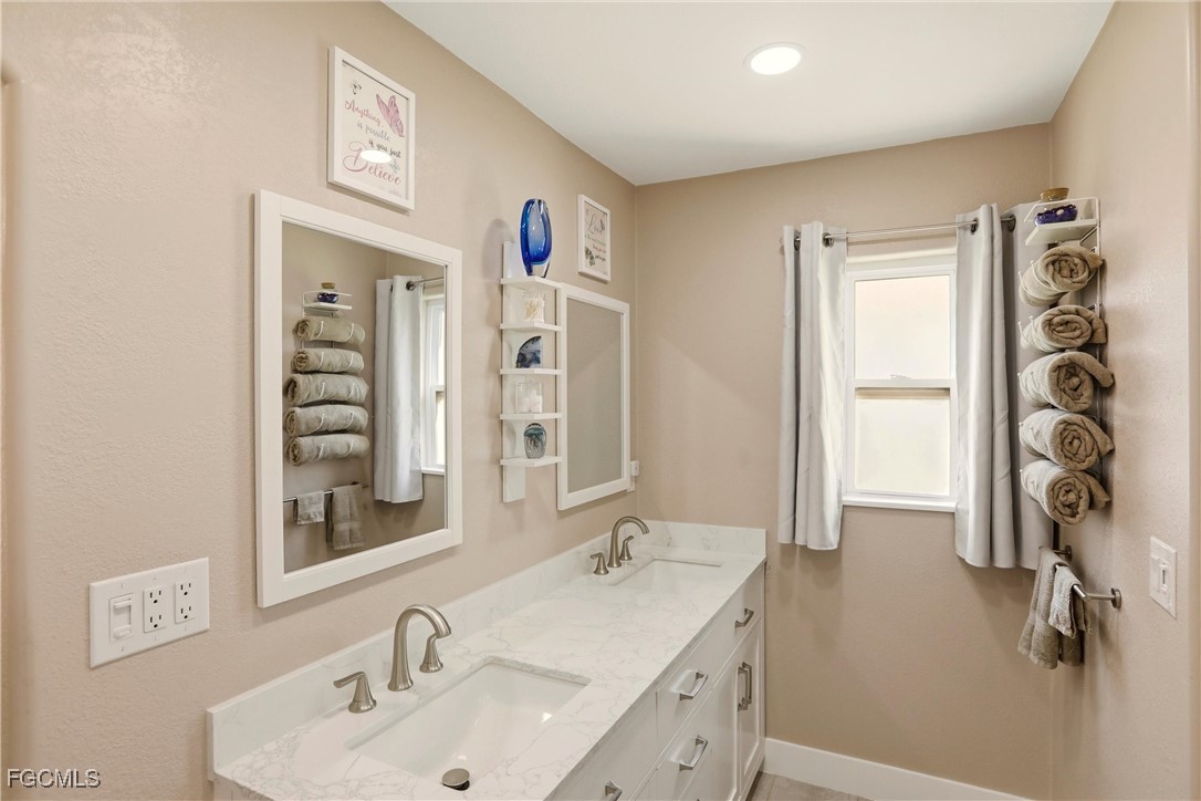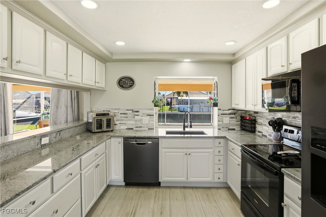 Two additional bedrooms and a freshly updated pool bath with walk-in shower are located on the opposite side of the home. The oversized lanai and pool area offer abundant space to create an outdoor kitchen and additional entertaining areas. A custom stone waterfall built with stones from North Carolina enhances the private waterfront setting. Indoor laundry with utility sink and a two-car garage complete the home.
