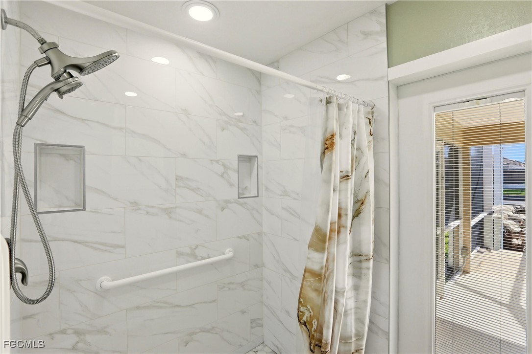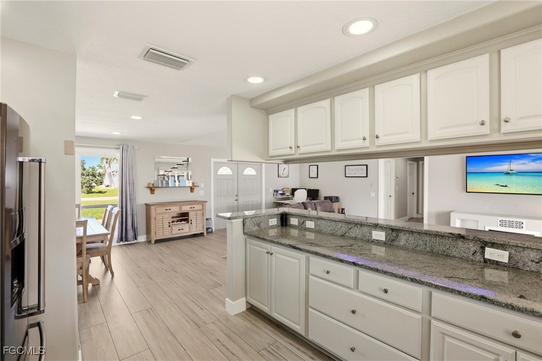 This 3-bedroom, 2-bath split floor plan home welcomes you with immediate views through the sliders to the pool and water beyond. The dining area flows into a spacious kitchen with ample cabinetry and a pass-through window to the lanai, ideal for entertaining. The primary suite, privately located on the right side of the home, features sliding glass doors to the lanai, water views, a walk-in closet, linen closet, and an updated bathroom with a tiled walk-in shower and seating.