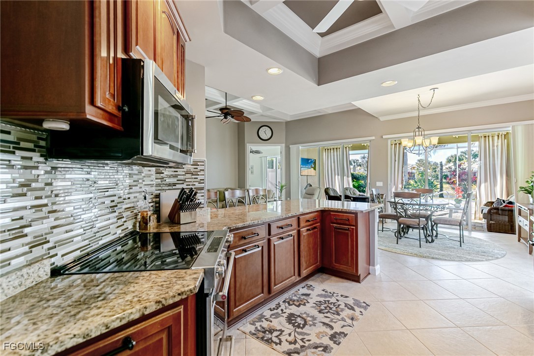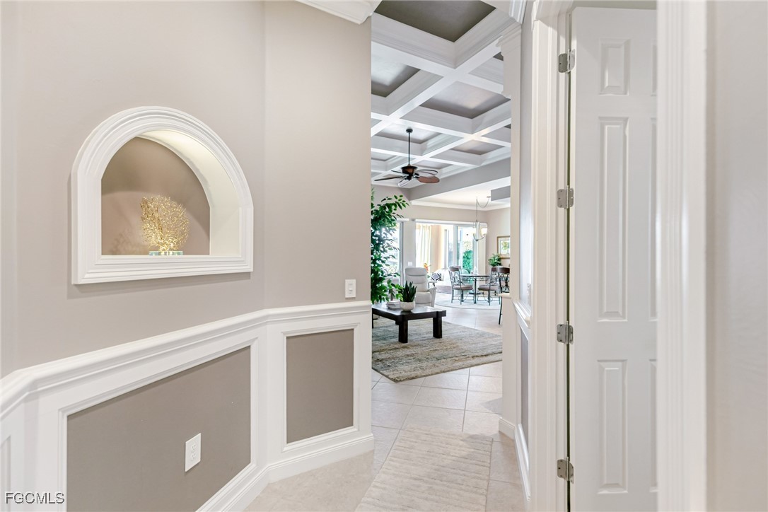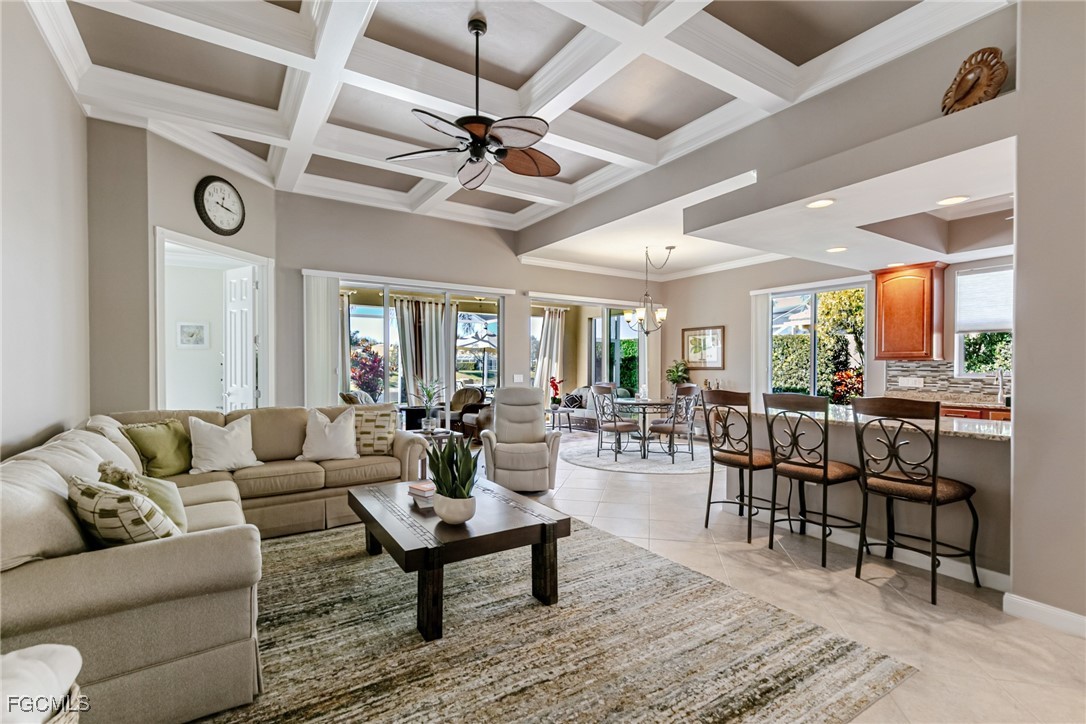 The open-concept floor plan features custom millwork, coffered ceilings, granite countertops, wood cabinetry, and stainless steel appliances, creating an inviting space for both everyday living and entertaining. The primary suite includes dual vanities, a soaking tub, a renovated walk-in shower, and private sliding glass doors leading to the lanai.