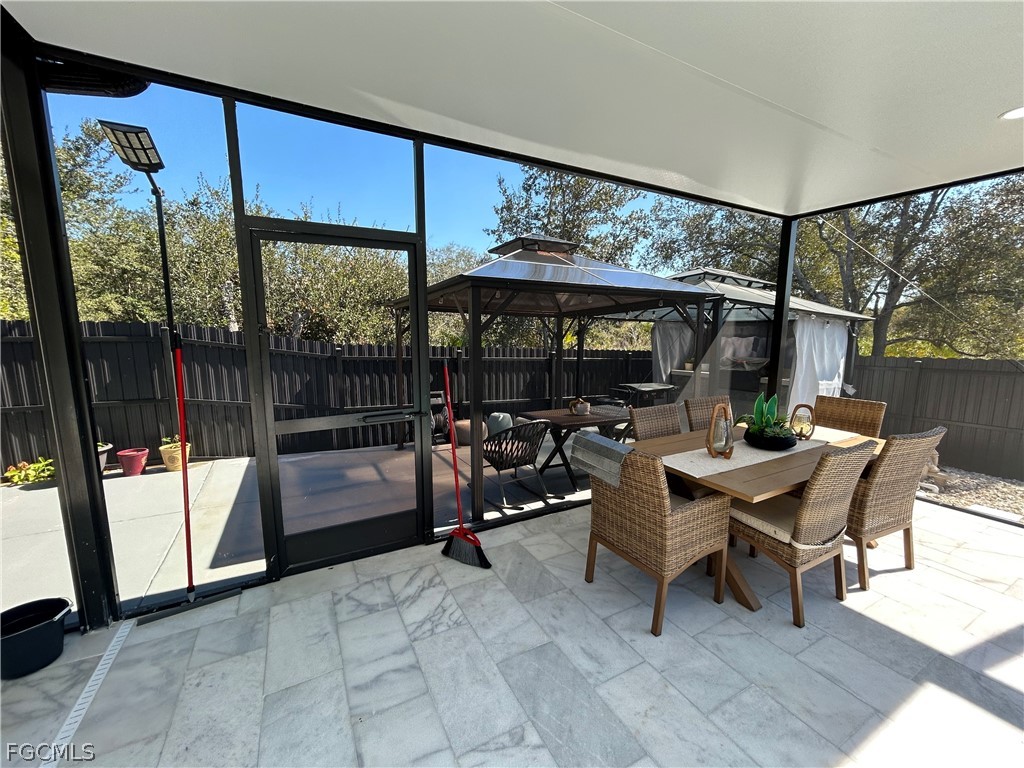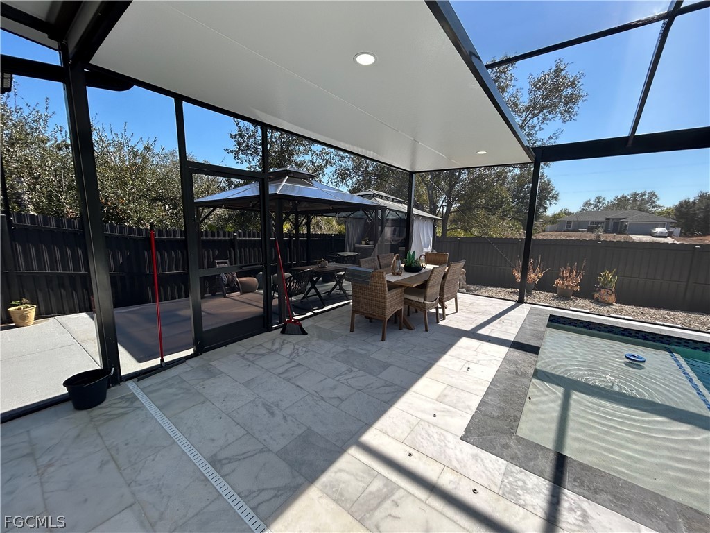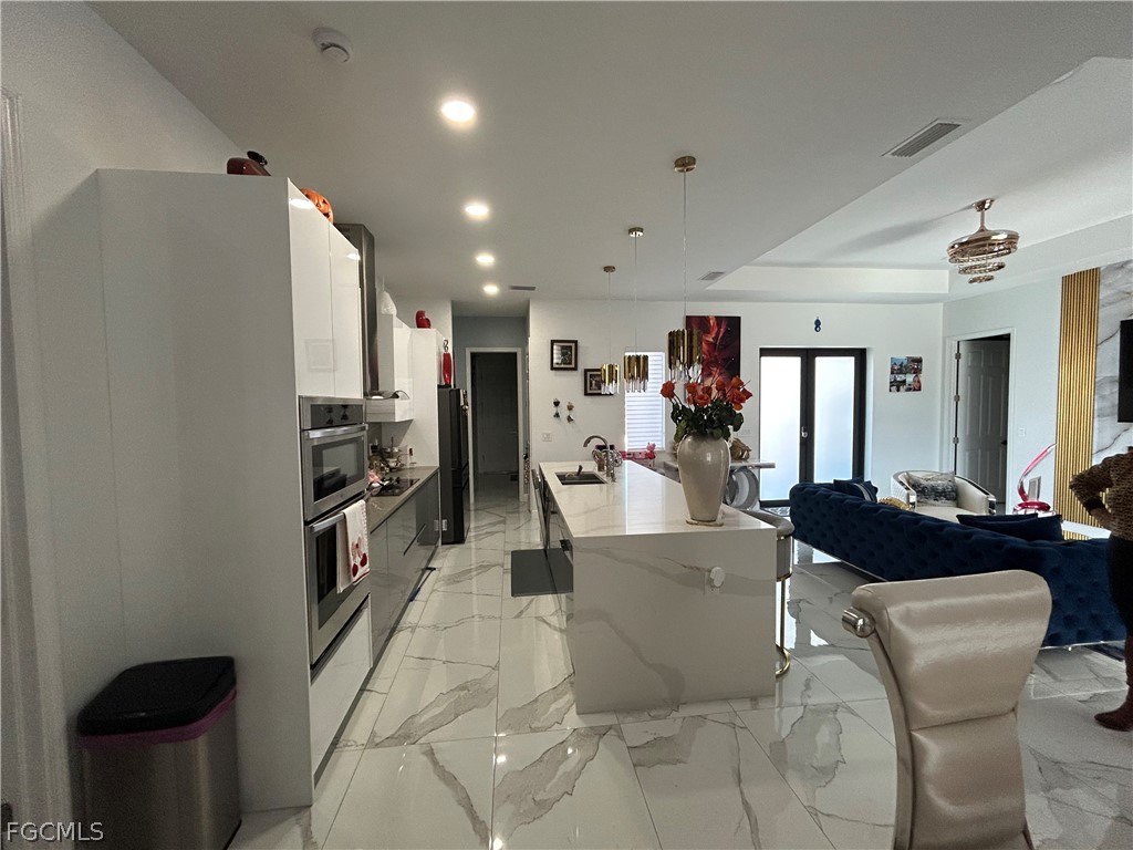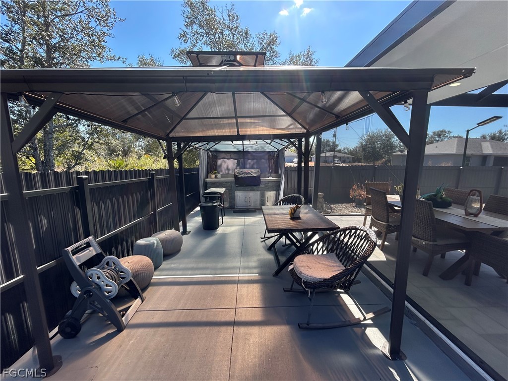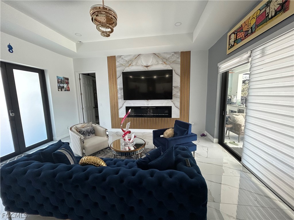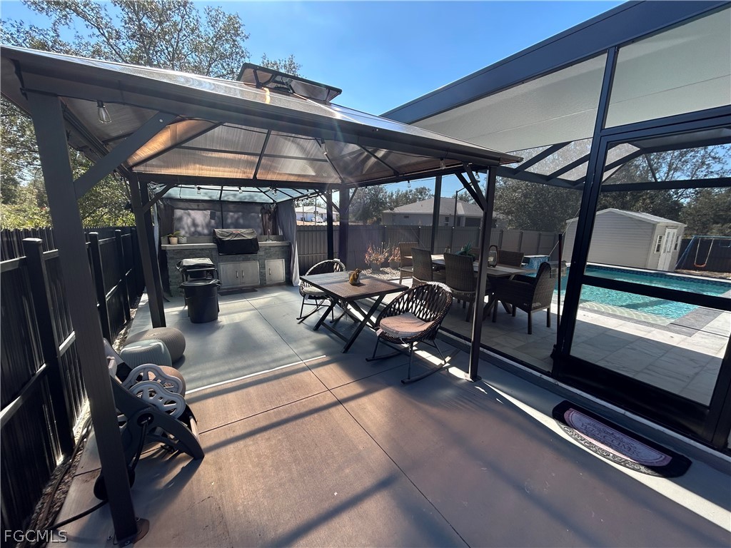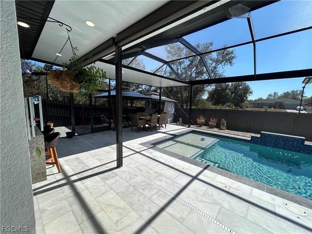 Don't miss out on this 2023 Southwest Florida pool home accented with porcelain tile all throughout, coffered ceilings, impact resistant windows, and modern finishes. This stunning space boasts a fully custom kitchen complete with quartz countertops, custom made cabinetry, and a range hood. Stainless steel kitchen appliances, as well as a washer and dryer are included in the sale. The beautiful living room features a a remote-controlled fireplace and marble style accent wall. Enjoy the spaciousness of 4 bedrooms and 3 baths. Other features include an outdoor kitchen area and a saltwater pool with electric heating. The property also has a fence around the backyard, a connection for a generator, and automatic sprinklers. The seller is willing to contribute to the buyer's closing costs. Your dream home awaits, schedule your showing today!