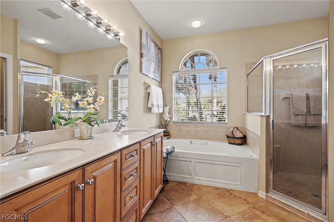 The kitchen offers granite countertops, wood cabinetry, and stainless appliances, opening to a spacious great room ideal for entertaining. The private primary suite is tucked away with custom California Closets, lanai access, dual vanities, soaking tub, and walk-in shower. Guest bedrooms are positioned on the opposite side of the home for added privacy, along with a flexible den perfect for a home office or media space.