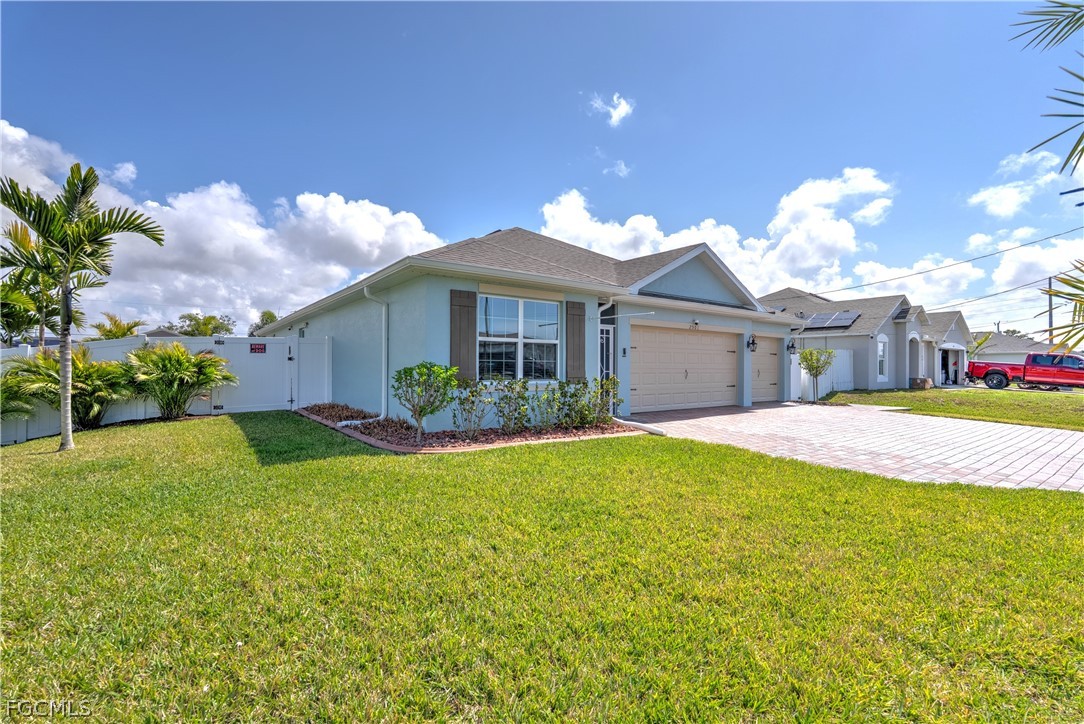 Better than new and truly move-in ready, this beautifully upgraded Madison model was built just three years ago and offers 4 bedrooms, 3 full bathrooms, a 3-car garage, and 2,020 square feet of well-designed single-story living in desirable Northwest Cape Coral. The open-concept floor plan features durable tile throughout the main living areas and upgraded carpet in the bedrooms. The spacious kitchen overlooks the living and dining areas and serves as the heart of the home, showcasing stainless steel appliances including an LG French-door refrigerator, ample cabinetry, a large pantry, generous quartz counter space, backsplash, and a farmhouse sink. All bathrooms feature custom-tiled shower walls and stylish upgraded light fixtures with cabinets. The private primary suite includes a spacious bedroom, walk-in closet, and en-suite bath with dual sinks and a glass-enclosed walk-in shower. Three additional bedrooms provide flexibility for guests, a home office, or a separate en-suite, with two full bathrooms offering added convenience. Additional features and upgrades include epoxy-coated garage floors, insulated garage doors, extra attic insulation, extended pavers in the driveway, lanai and along one side of the home, as well as an under-truss screened lanai with privacy shades. The home also offers a wireless Eufy security camera system, screened front entry, automated irrigation system, upgraded Floratam sod, professionally landscaped with trees, shrubs and curbing, gutters around the entire home, and a vinyl privacy fence—ideal for kids or pets. A 7x10 Superior Shed provides additional storage. Interior conveniences include a top-of-the-line whole-home reverse osmosis system, an indoor laundry room with Samsung front-load washer and dryer, remote-controlled ceiling fans in all bedrooms and on the lanai, and a remote-controlled AC system unit with additional ceiling lighting in the garage.