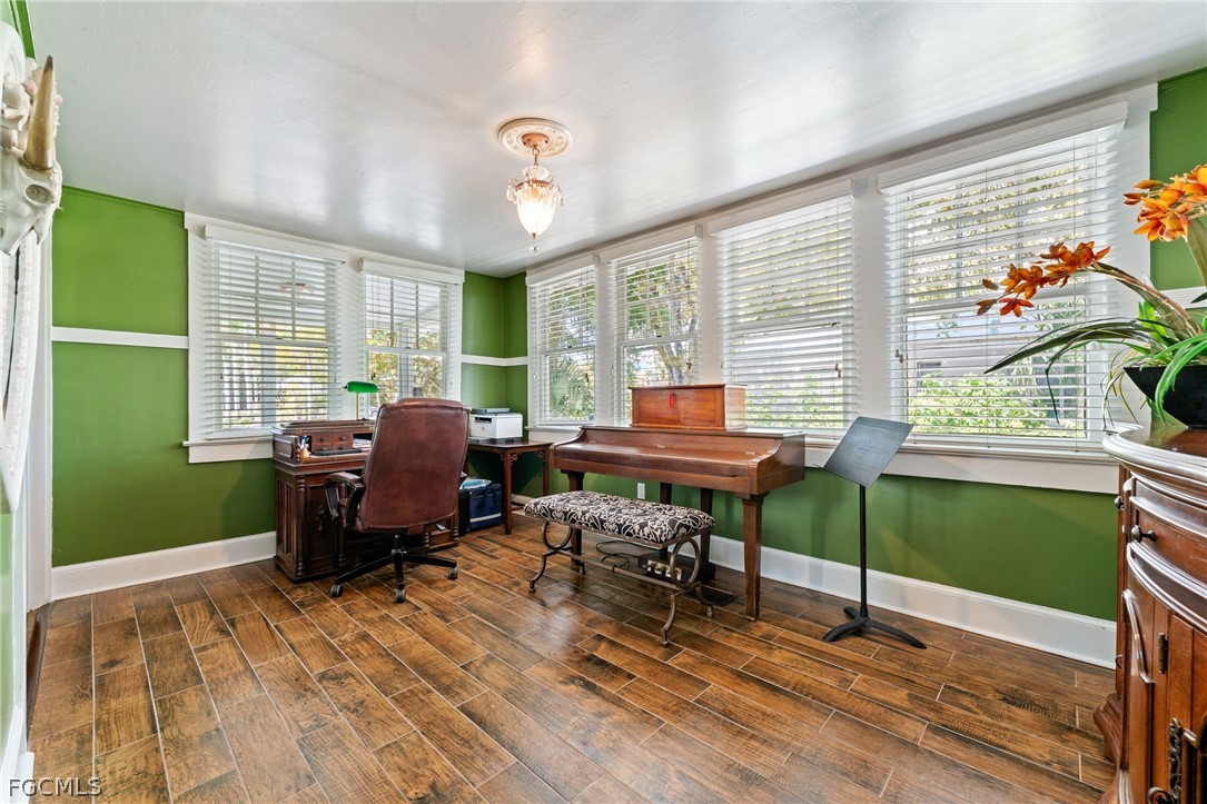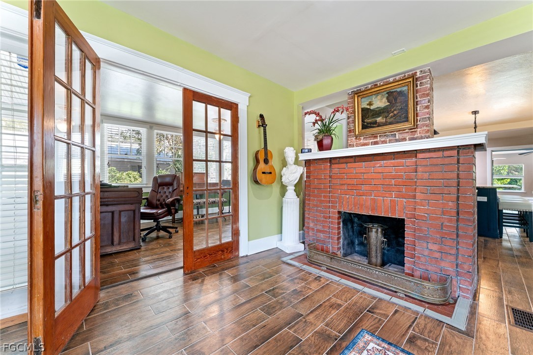 Inside, natural light fills rooms lined with windows, many of the original casement windows still intact, allowing beautiful Florida sunshine to stream throughout. The spacious living room features an original brick fireplace as a warm focal point, while a charming sunroom just off the main living area provides the perfect space for morning coffee or evening relaxation. A dedicated study or music room adds flexibility and character.