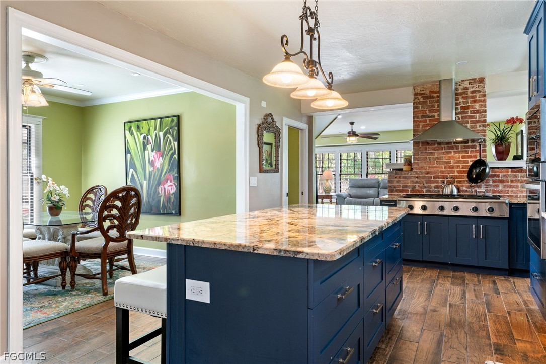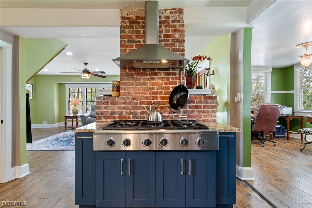 The updated kitchen features a six-burner gas range and opens to a generous dining and breakfast room with built-ins, blending historic charm with modern functionality.