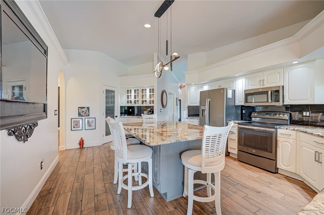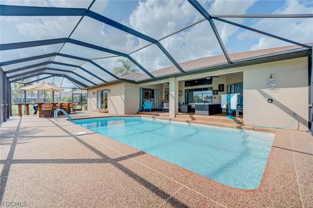 This beautifully upgraded home features 4 spacious bedrooms, a private office or den, 2½ bathrooms, plank tile flooring throughout, vaulted ceilings and a convenient separate pool bath, thoughtfully designed for both everyday comfort and effortless entertaining. The open and inviting floor plan showcases abundant natural light, generous living spaces, and tasteful upgrades throughout. The heart of the home flows seamlessly to the outdoor oasis, where a resurfaced pool (2023) and newly re-screened pool cage (2023) create the perfect setting to relax or host gatherings year-round. Enjoy peace of mind with extensive recent improvements, including a new roof (2023), soffits replaced (2024), and fresh exterior repainting (2024). Additional upgrades include a new pool pump and filtration system (2025), pool filter housing (2025), revamped irrigation well (2025), kitchen appliances replaced between 2024–2025, and a new hot water heater (2026) — ensuring modern efficiency and low-maintenance living. Completing the home is a 2-car garage, mature landscaping, and a rare, tranquil location within one of Cape Coral’s most sought-after golf communities. Experience the relaxed elegance and lifestyle that make Cape Royal so special. Come discover your private retreat and experience the Cape Royal lifestyle.