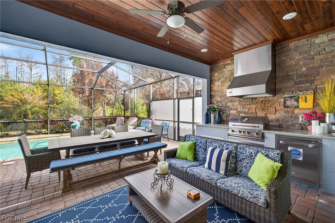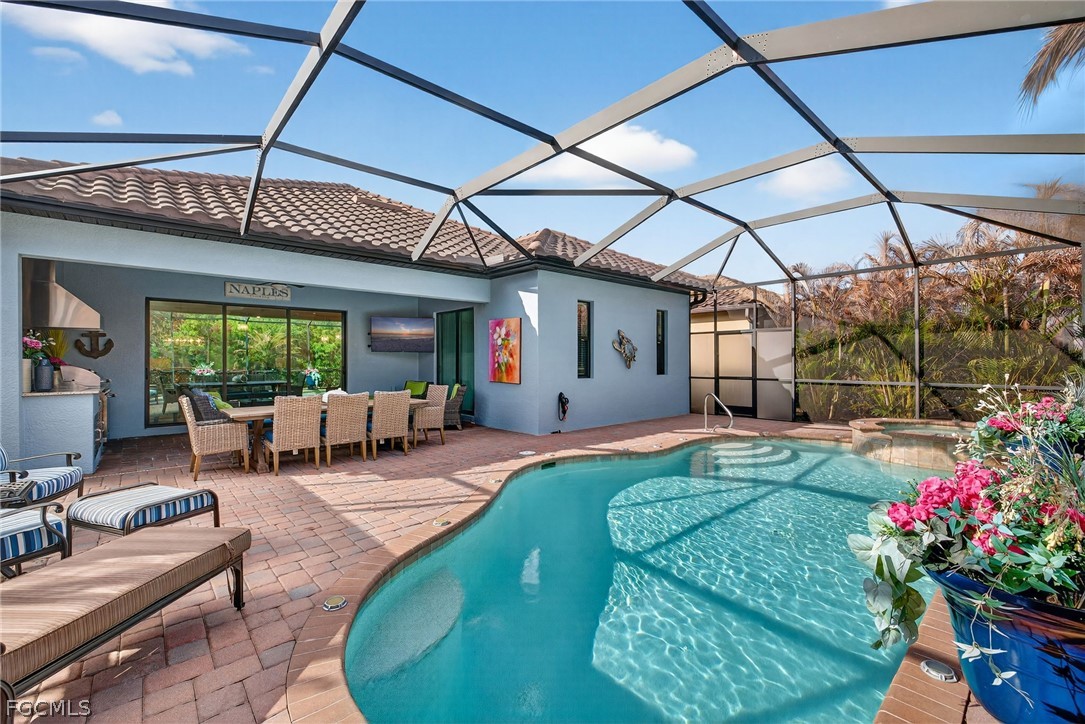 Experience resort-style living at 17200 Galway Run, a meticulously upgraded residence in the prestigious Bonita National Golf & Country Club community. This is known as the "Maria" layout which gives you 3 spacious bedrooms, 1 den, 3 full bathrooms and a 2-car garage. Garage updates include epoxy flooring and built in storage on each wall. Walking inside, you'll notice instantly that this home transcends the standard with high-end custom finishes throughout the entire floor plan. As you move through the foyer, your feet meet the diagonal tile flooring that leads you into an open great room area, anchored by a sleek built-in bar that gives effortless entertainment. Upward you have recessed lighting and sophisticated custom woodwork on the ceilings, complementing the relaxing living room. To your side, the modern kitchen is lined with granite countertops, solid wood cabinets, custom backsplash, a walk-in pantry, stainless steel appliances and upgraded ceiling fixtures that catch the light of the updated paint palette of the home. Those same kitchen and living areas flow toward the outdoors and through the sliders to your private screened in lanai - featuring a beautiful pool & spa, outdoor kitchen, stunning wood-finished ceiling, integrated solar lighting, and custom privacy screens. You may even notice the additional sliders leading into the primary bedroom of the home. This spacious room is lined with tile and framed by fresh, neutral paint and upgraded ceiling fixtures. The transition into the ensuite bathrooms leads you past 2 walk-in closets with ample storage and into your dual-sink and shower area. On the opposite side of the home, a hallway leads to the versatile guest wing, ensuring a "split" layout that maximizes privacy for everyone residing. Each guest room features wood or tile flooring, updated paint schemes, and updated ceiling fixtures. Centered among these rooms is a spacious flex space with double french doors, perfectly positioned to serve as a home office, cozy den, or a hobby room. This guest wing also shares a beautifully appointed, full size bathroom and the laundry room/ garage access. Ensuring peace of mind, this home also has hurricane impact doors and windows in addition to plantation shutters throughout! As a non-golf homeowner at Bonita National, you still have access to many incredible amenities, including a clubhouse with formal and casual dining, the beach entry resort-style pool, poolside bar & grill, a pro shop, 8 Har-Tru tennis courts, a full-service spa, fitness center, and MORE! Social homeowners do get to enjoy golf as a guest of a member out of season too! Don't forget, at Bonita National, you are also conveniently located close to I-75, shopping, dining, and SWFL Stunning beaches! Your neighbors are waiting! Come check out what the Bonita National Golf & CC lifestyle is all about!