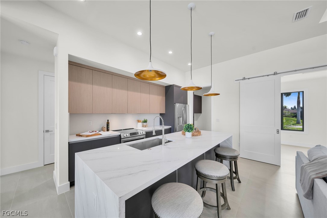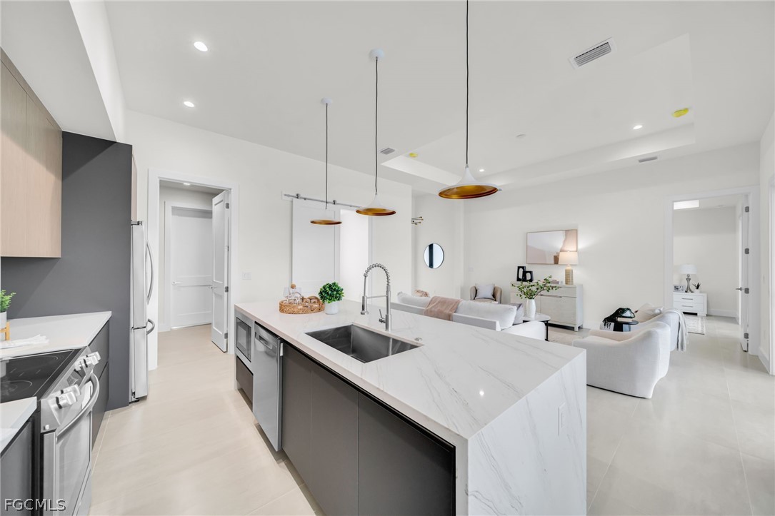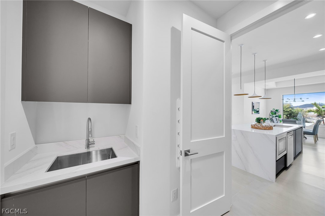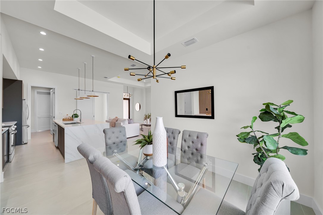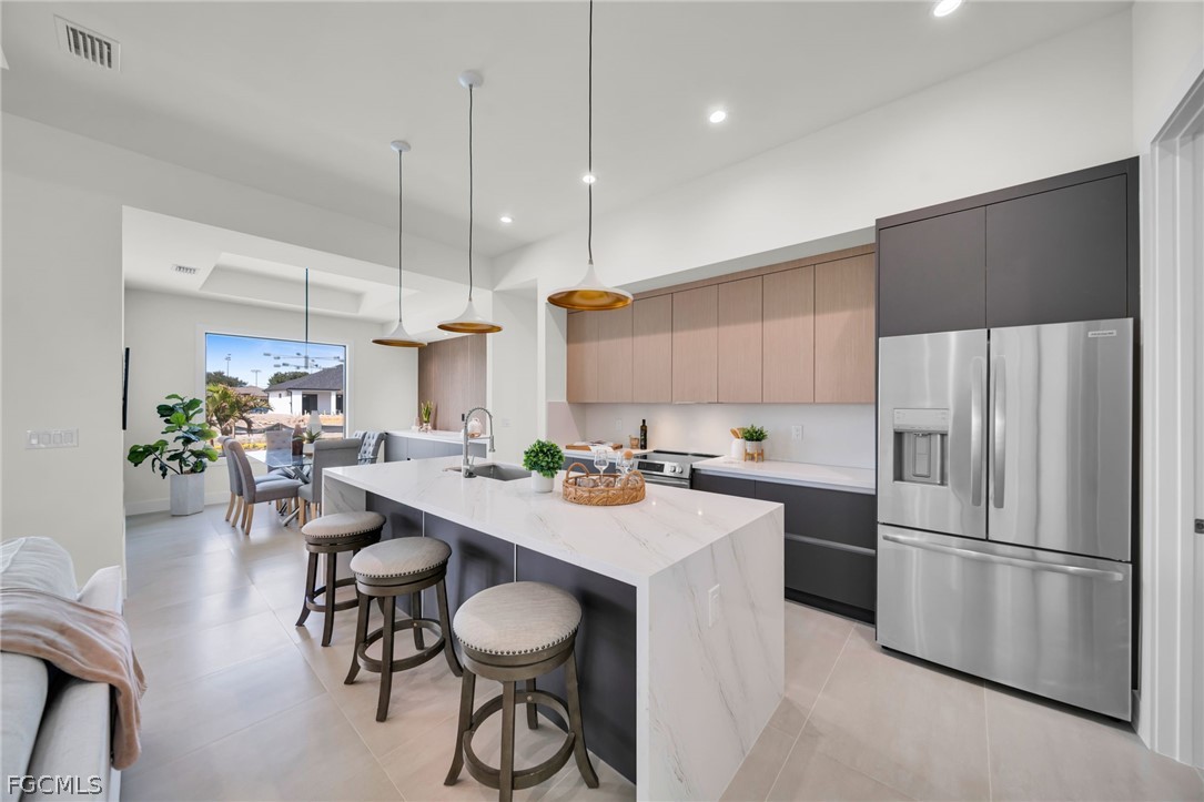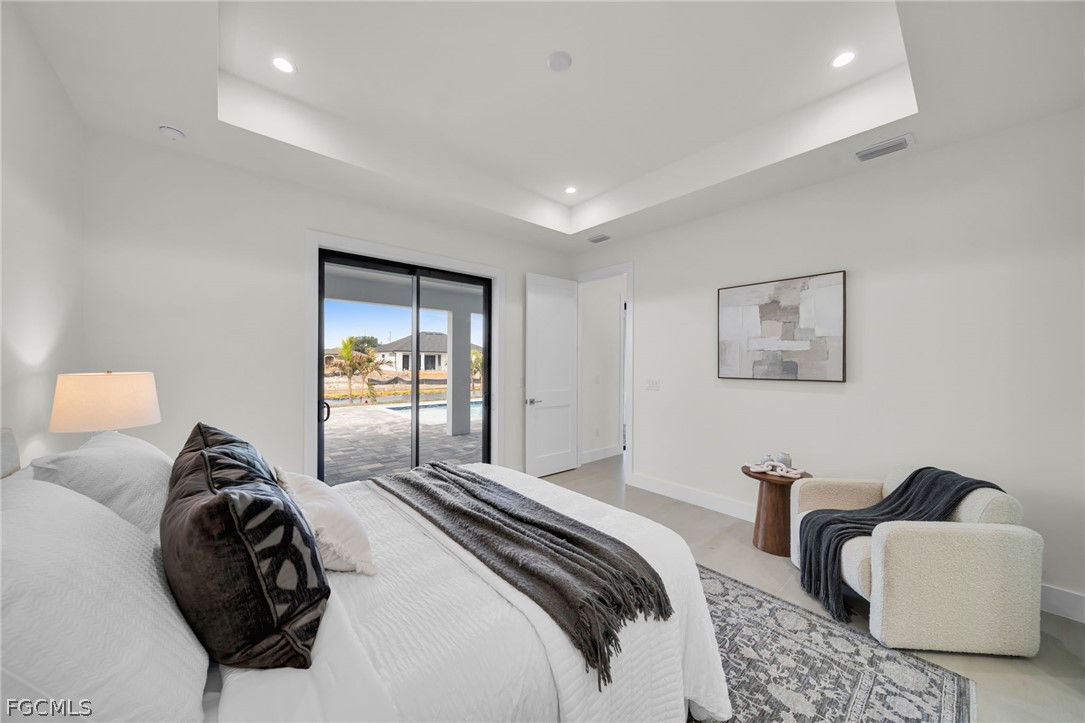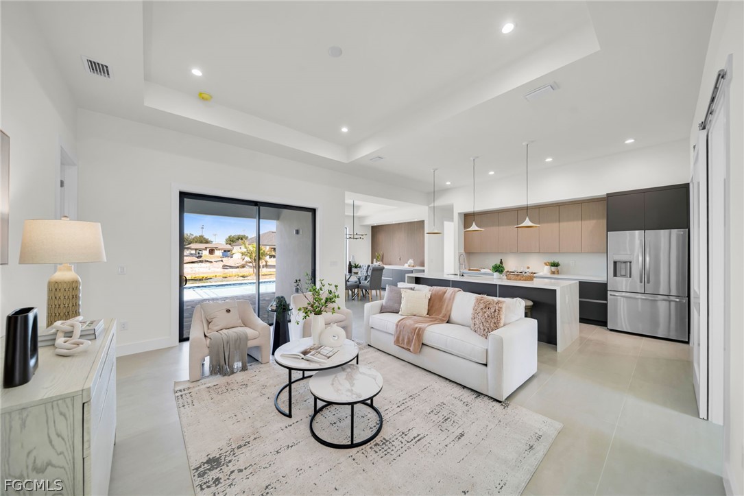 This new construction, pool home with 4 bedrooms and 2 bathrooms, is ready for a family to call their own! The open concept floor plan with 12 feet ceilings provides a bright space with plenty of natural light. Modern touches throughout the home include porcelain tile, quartz countertops, custom kitchen and closet cabinet and a beautiful soaking tub! The home offers hurricane impact doors and windows as well as a glass hurricane impact garage door ensuring safety and peace of mind. The outdoor oasis features a summer kitchen with built in BBQ and a pristine pool with a sun shelf, and beautiful water views, perfect for entertaining or relaxing under the Florida sun. Centrally located, this property offers convenient access to groceries stores, restaurants and schools, all within a 5-minute drive. Will also be a short drive to the upcoming projects 7-Island and Cape Coral Grove, truly the perfect location. The home has city water and sewer. Schedule your private showing today!