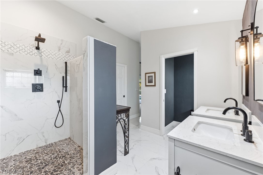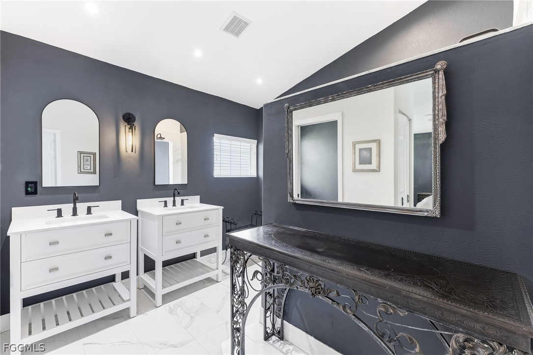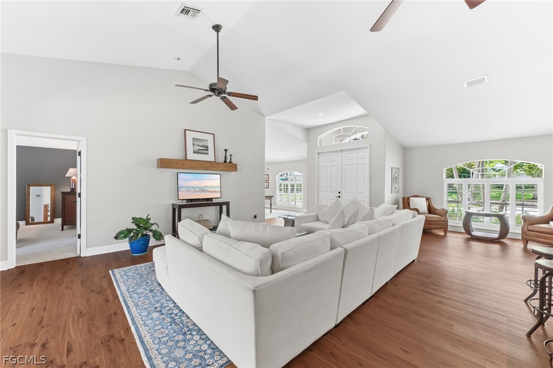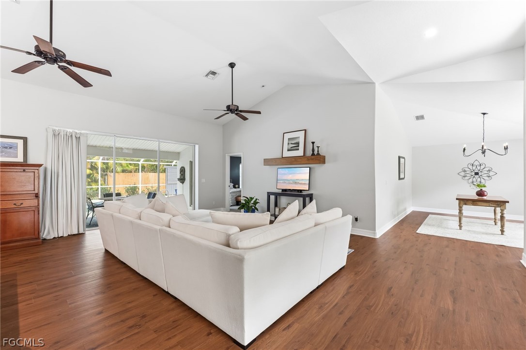 Coastal sophistication located in the heart of 33901!!! This magnificent pool home offers 4 bedrooms, 2 baths & over 2,500 square feet all on an oversized corner lot. Fully updated in 2022 and NOT located in a flood zone this home is sure to impress. Open concept living space features vaulted ceilings, plenty of natural light, formal dining area and ample storage throughout. The true showstopper of this home is the unbelievable custom kitchen with stone accent wall, spacious quartz island, decorative kitchen hood and stainless appliances. Primary suite offers spa like tranquility with dual vanities, dual closets including one walk-in, water closet, large walk-in shower and sliders that open directly to the lanai. Guest rooms are located on the opposite side of the home and include two generous sized bedrooms, full bathroom + huge 4th bedroom/bonus room. This home is perfect for entertaining with its pristine salt water pool, expansive pool deck and screened lanai surrounded by lush tropical landscaping. Pool was recently resurfaced with Pebble Tec, pool equipment (2023) and custom louvered patio panels that provide additional privacy.