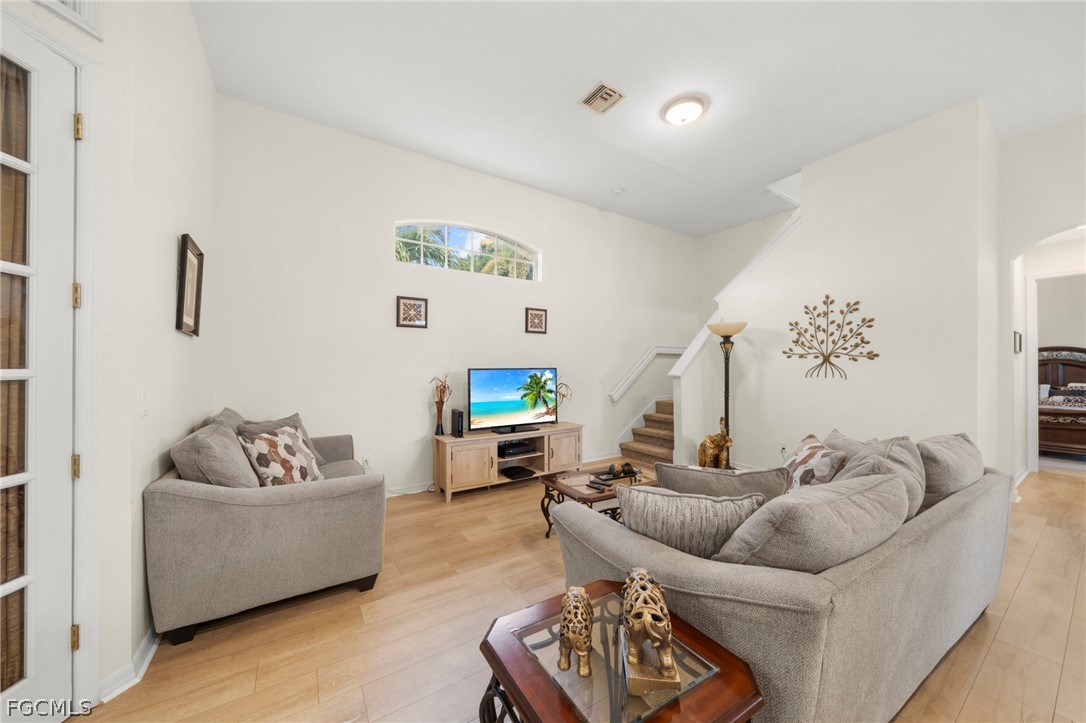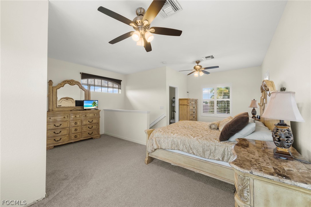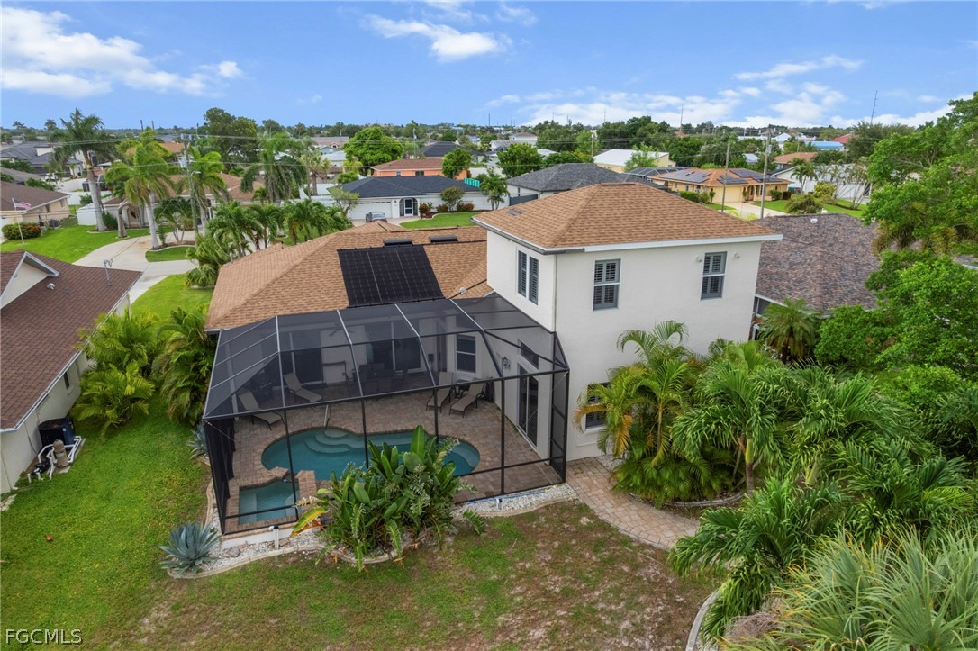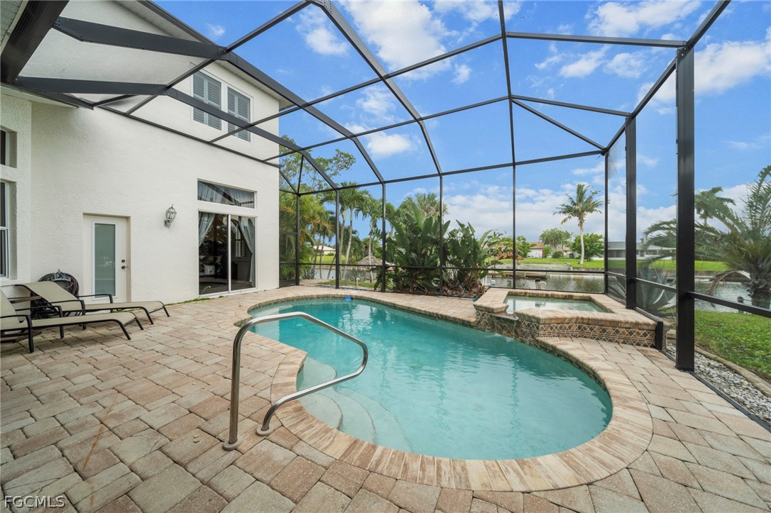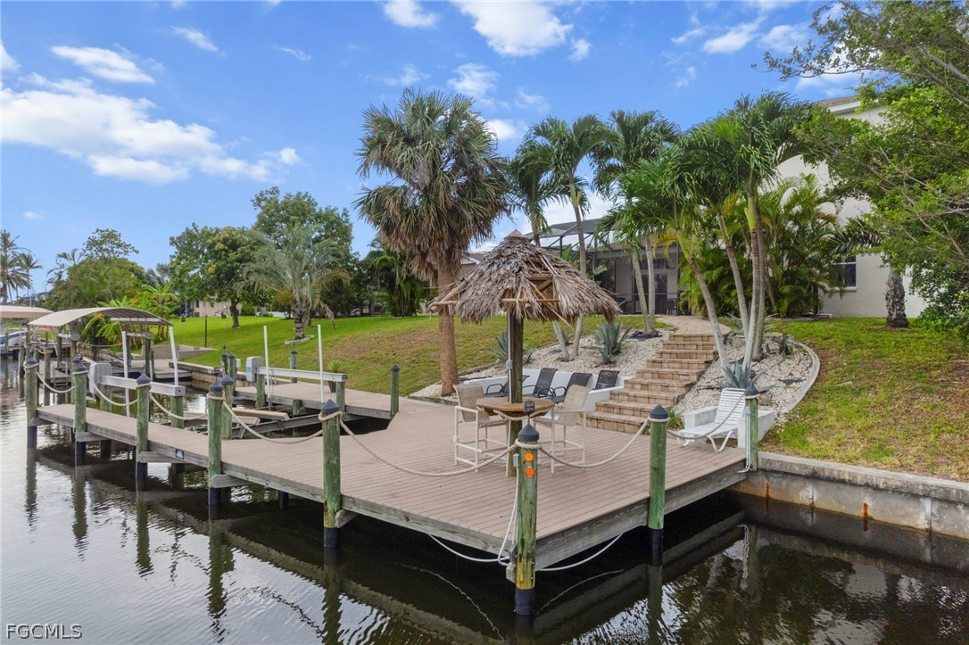 Gulf Access pool home with fast boating access and southern exposure, situated on an extra wide 120 plus foot canal offering quick access to open water. The property features a wrap around dock with boat lift and a Tiki hut, creating the perfect setting for boaters and waterfront living enthusiasts. Built in 2004 with quality construction and elegant architectural details, this home offers 3 bedrooms plus a den, 3 full bathrooms, and a deep 3 car garage. High ceilings throughout include 12 foot ceilings, 13 foot tray ceilings, and 8 foot doors, creating a bright and spacious atmosphere. The open concept floor plan is designed for both comfortable everyday living and entertaining, with water views from nearly every room. The kitchen offers abundant cabinetry, generous counter space, and bar top seating ideal for gatherings and casual dining. The main floor primary suite overlooks the pool and canal and features dual walk in closets, dual vanities, a soaking tub, and an impressive walk through shower. Upstairs, a private second primary suite provides elevated views of the water and pool, making it ideal for guests or multigenerational living. Additional guest bedrooms are spacious and located near full bathrooms, creating an ideal layout for families, seasonal visitors, or potential vacation rental use. Outdoor living is exceptional. With sought after southern exposure, the pool area enjoys sunlight throughout the day. Relax in the resort style pool and spa while overlooking the canal and dock. The outdoor space is perfect for entertaining, enjoying quiet waterfront evenings, or returning from a day on the water. Recent improvements include a new roof installed in 2023 along with a paver driveway and numerous upgraded finishes throughout the home. The property experienced no water intrusion during hurricanes. The location places you in one of Cape Coral’s most active growth corridors. Just minutes from Starbucks, Target, Publix, restaurants, and shopping along Del Prado. Nearby waterfront destinations include Bimini Square, The Cove at 47th, Slipaway Marina, and the transformational Yacht Club Beach and Marina redevelopment, bringing new resort style pools, marina expansion, dining, boutique retail, and community gathering spaces. With Tarpon Point Marina, The Westin Cape Coral Resort, Palmetto Pines Country Club, and Coral Oaks Golf Course all nearby, this home places you at the center of boating, dining, entertainment, and future growth.