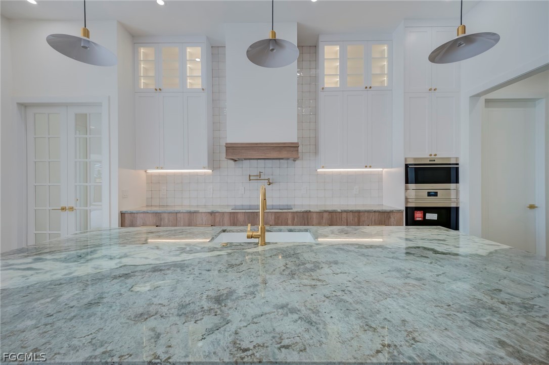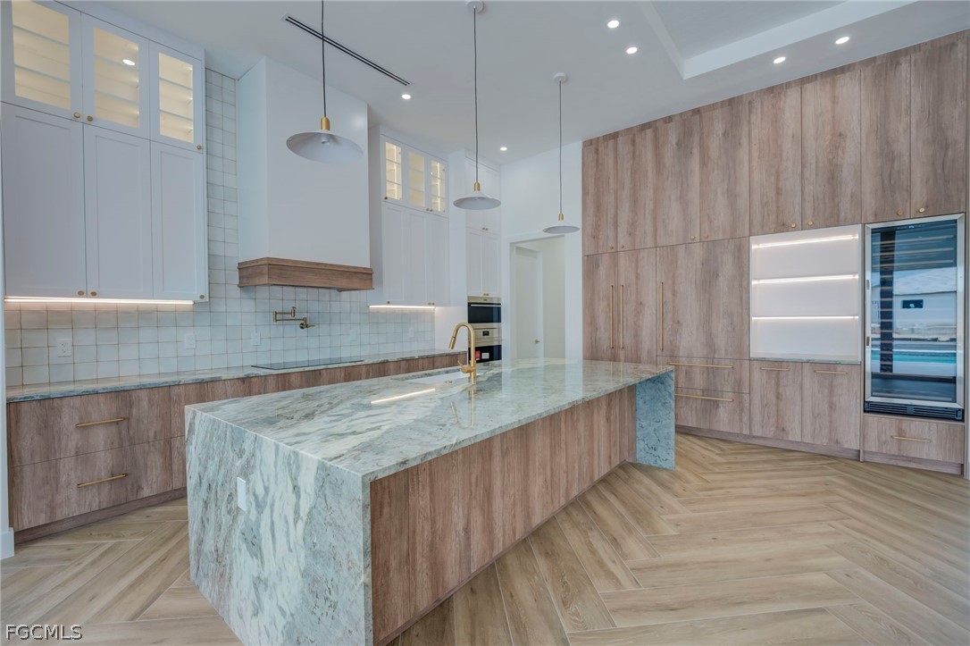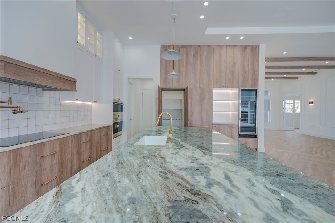 The gourmet kitchen is a stunning centerpiece featuring custom Italian cabinetry, luxurious quartzite countertops with a waterfall island, and premium Sub-Zero and Wolf appliances. An oversized hidden walk-in pantry adds style and convenience, complemented by high-end fixtures and designer lighting.