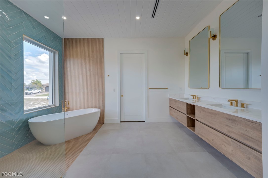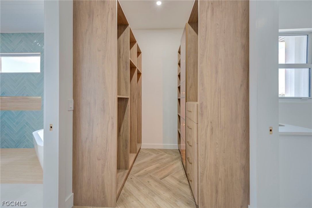 The primary suite offers a private retreat with custom-built closet systems and a spa-inspired bath featuring a statement shower, soaking tub, dual floating vanities, and convenient access to the laundry room through the master closet.