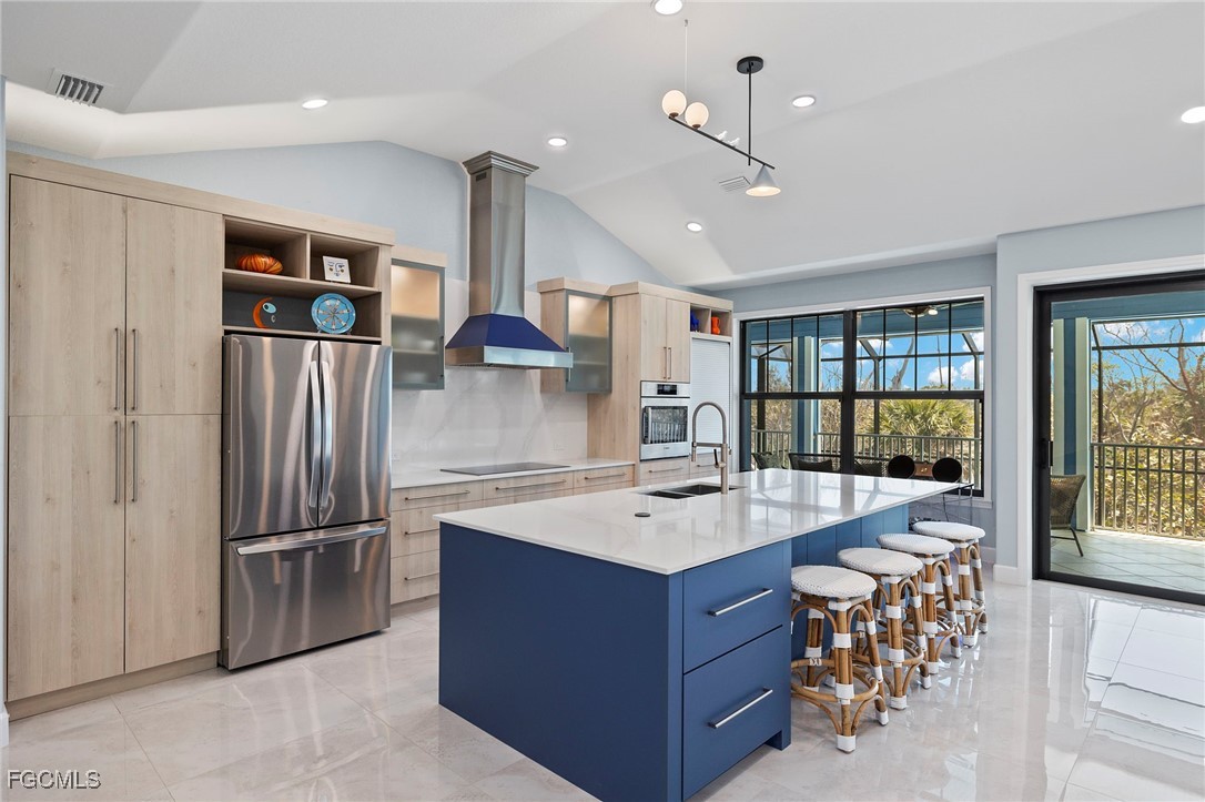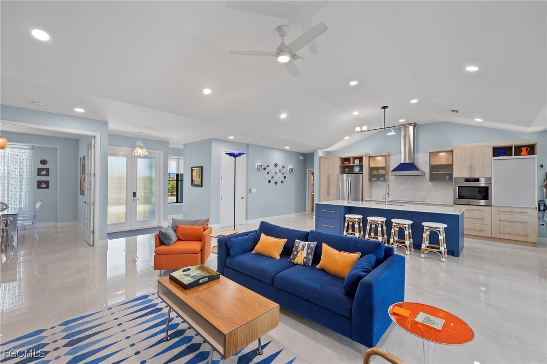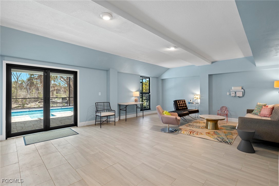 The main living area showcases cathedral ceilings and gleaming 32" × 32" high-gloss tile flooring, setting a modern yet inviting tone. An enclosed lanai overlooks the surrounding preserve—a front-row seat to island wildlife, ideal for morning coffee, afternoon reading, or peaceful evenings surrounded by nature.