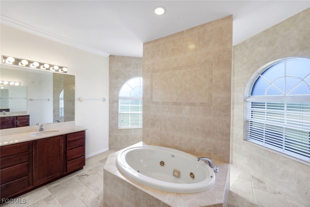 The expansive owner’s suite includes lanai access and an en-suite bathroom with dual vanities, a soaking tub and a separate shower. Three additional bedrooms provide ample space for guests or a home office.