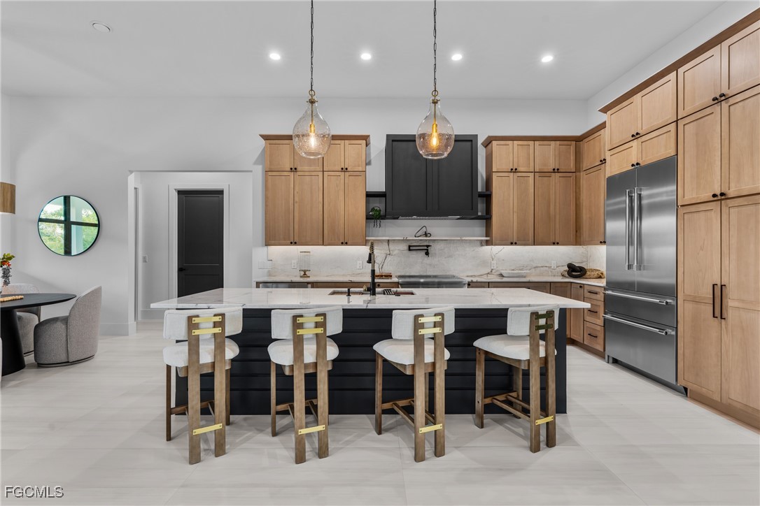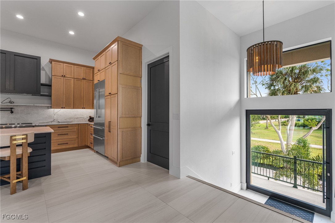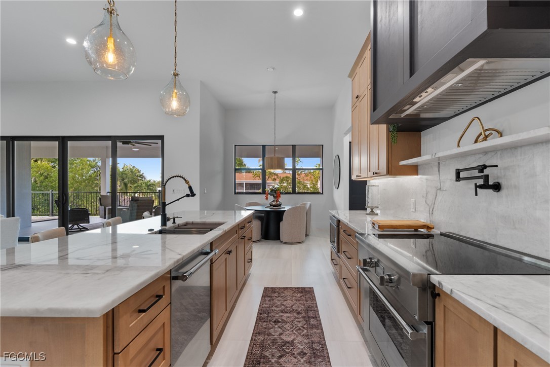 Stunning NEW construction gulf access home on an oversized 0.45-acre lot with direct boating access, private dock + boathouse, and elevated main living above 12’ NAVD. Offering 2,448 SF living + 1,100 SF recreation space below: 4 bedrooms + home office/den, 3 bathrooms and modern luxury throughout. Gourmet kitchen with Thermador appliances, quartzite countertops, 12’ island & double-stacked custom cabinetry. Great room showcases a floor-to-ceiling water-vapor fireplace and expansive sliders to the lanai with sunset water views.