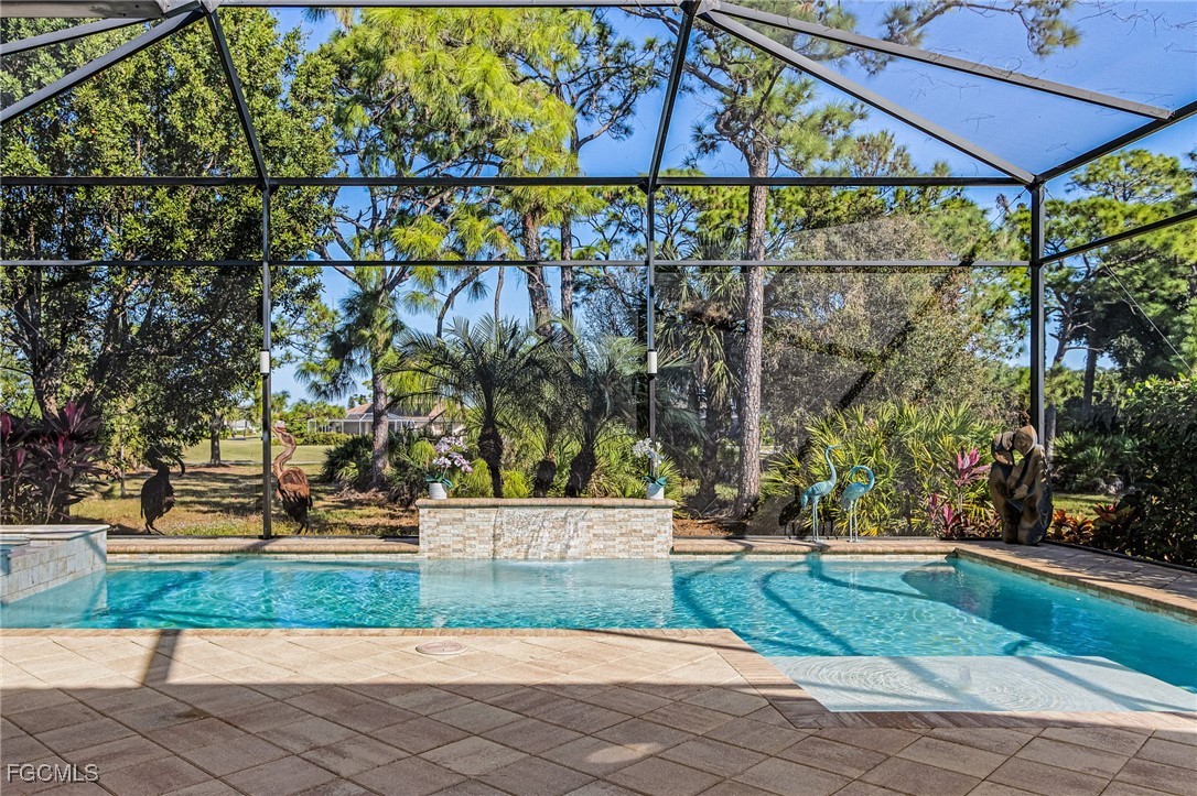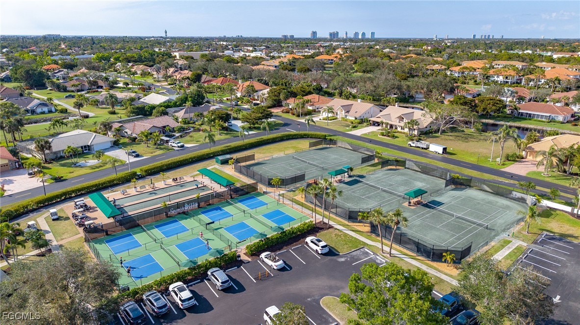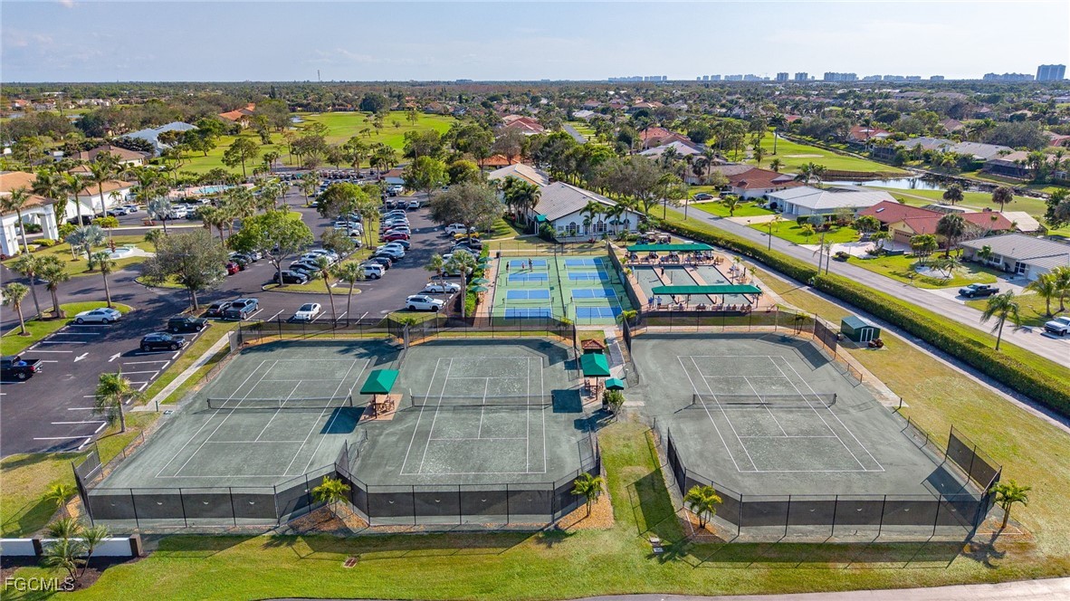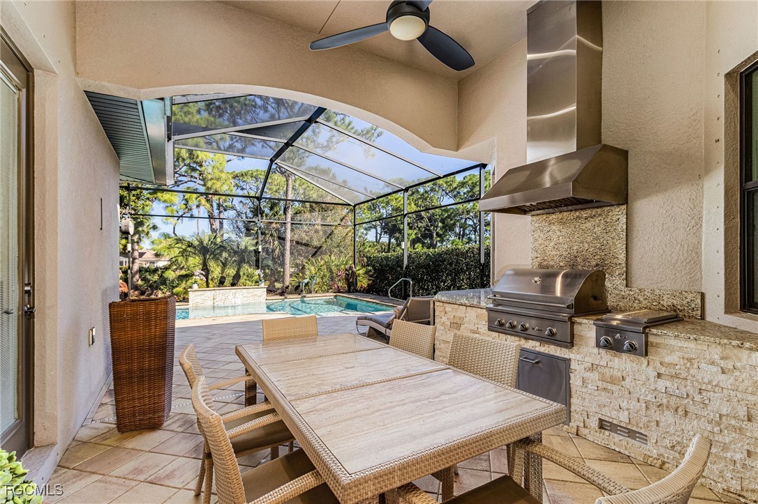 from granite tops in kitchen and baths, custom built in desk and wood flooring in the den/office, custom closets, to stunning built in shelves and cabinets with electric fireplace in the living room. Kitchen has custom pantry and dry bar with built in wine fridge and cabinet storage on both side of island. Outdoors features a large sunny pool with sun shelf and cascading water feature and attached spa, surrounded by a paved sundeck and covered lanai with outdoor kitchen. In this natural-gas community, Cordova residents enjoy gas cooking and grilling, gas heat for their pool, even tankless gas hot water heating. Lawn maintenance, irrigation, internet, cable TV and social membership to the club included in HOA. Golf and sports memberships available for an additional fee. Spanish Wells Golf and Country club offers golf courses, formal and casual dining, tennis, pickleball, bocce courts and a fitness center with classes. Prime location close to the beach, restaurants and shopping.