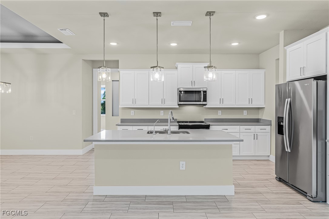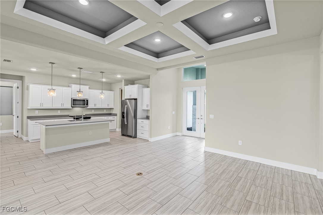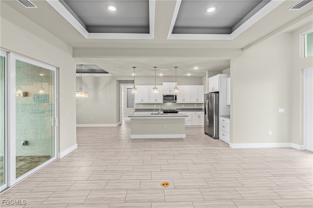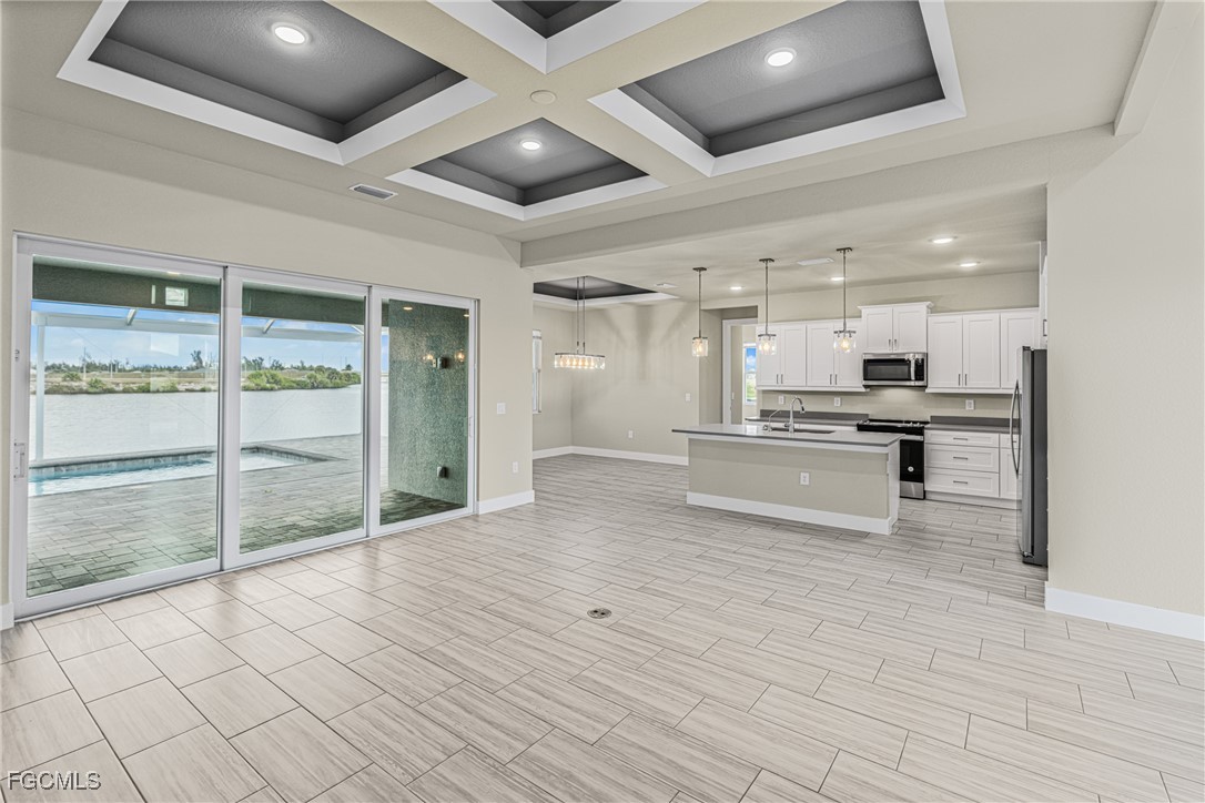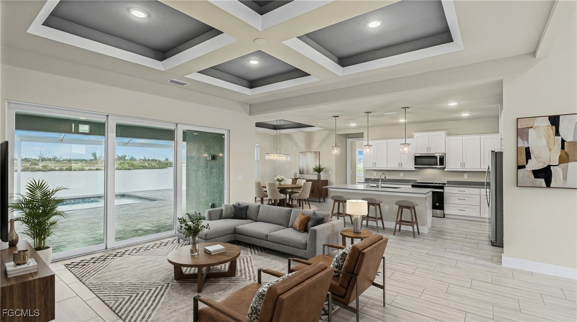 Experience exceptional Florida living in this stunning new construction home located on an oversized Gulf-access lot featuring 134' of seawall. Built with FULL IMPACT GLASS, double 1-lite impact front doors, 12x24 glazed ceramic flooring, and a sleek transitional stucco elevation, this property blends style and durability. The open great room offers a Criss-Cross tray ceiling, entertainment niche, TV drop, floor outlet, and upgraded 120V & 240V circuits for flexible media setups. The chef’s kitchen features a modern single-bowl sink and overlooks the expansive outdoor living area. The primary suite includes a freestanding tub and rain-head shower, while the second bedroom offers a full ensuite bathroom. Outside, enjoy a 12x24 heated saltwater pool with sun shelf & bubbler, a 20x45 paver deck, and a premium lanai enclosure with 16/14 Poly screen and picture-window rear panel. Additional upgrades include a 3-car garage with epoxy flooring, stacked-stone entry columns, side garage door, 4x4 equipment pads, gutters, and TV drops in bedrooms and lanai. A true Gulf-access gem built for comfort, beauty, and easy Florida living.