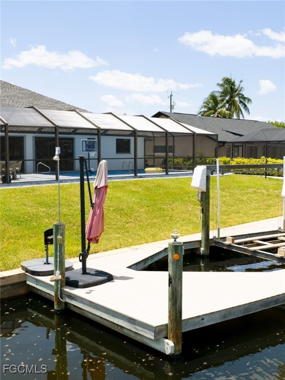 This spectacular 5-bedroom, 3-bathroom waterfront retreat in South West Cape Coral offers the ultimate Florida lifestyle, making it an exceptional choice for a high-performing vacation rental or a spacious family sanctuary. Situated in a premier yachting neighborhood, this home provides deep direct Gulf access with no bridges, allowing for effortless boating to the Caloosahatchee River and local beaches from your private composite dock and 10,000 lb walk-around boat lift. The property underwent extensive renovations in 2021 and 2022, including a brand-new roof, a massive kitchen remodel, and modern updates to two of the three bathrooms. Inside, soaring cathedral ceilings and cool tile flooring create an airy, expansive atmosphere, featuring a versatile floor plan where bedrooms can function as private suites, complete with a dedicated workout room.